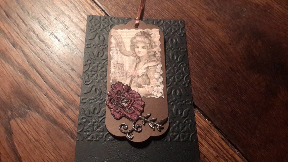 RESERVE》Marques pages, marron, lien assorti, motif dentelle guipure sur dessin jeune harpiste en découpe.