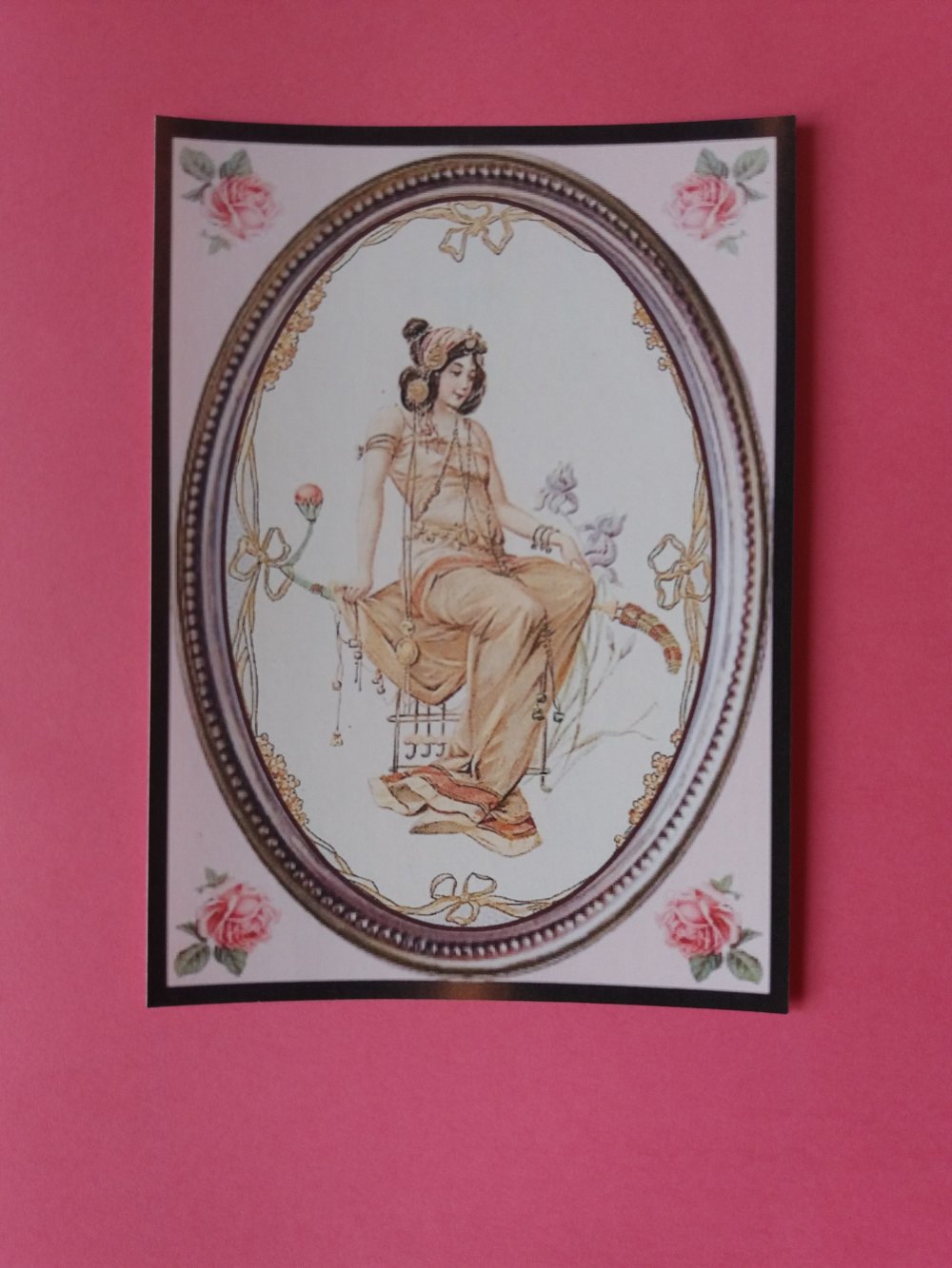 Sticker autocollant représentant une jeune femme rétro, en robe jaune, assise, dans un cadre ovale, lui-même dans un cadre romantique fond rose avec décor fleurs dans les angles.