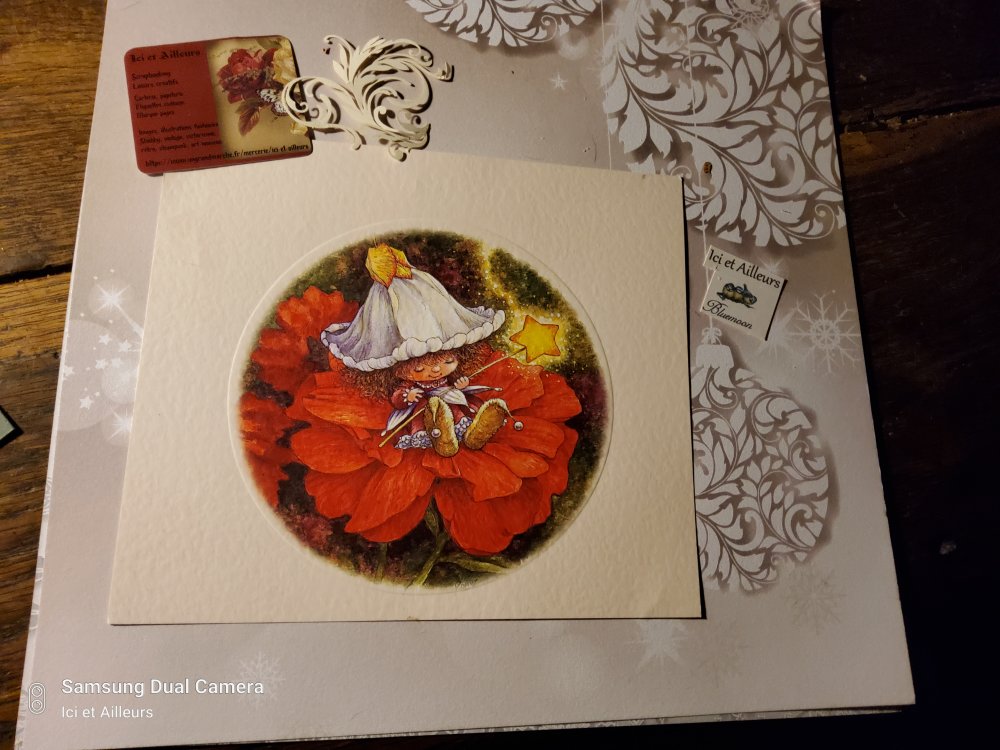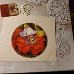 Craquante carte, grand format, petit lutin, fée des fleurs, délicatement assise sur belle fleur rouge