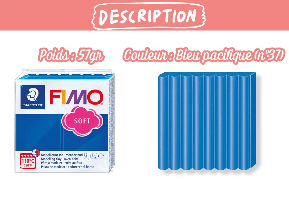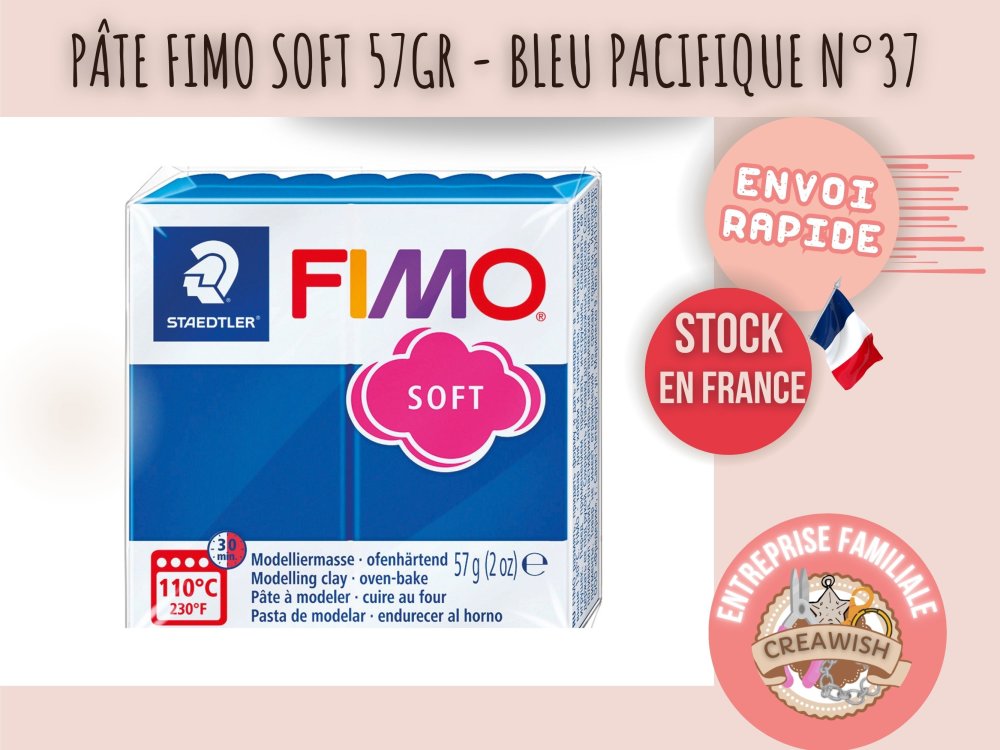 Évadez-vous vers les tropiques avec la pâte Fimo Soft 57g – Bleu Pacifique n°37. Ce bleu frais et vibrant, légèrement turquoise, évoque les lagons paradisiaques, les ciels d'été sans nuage et les ambiances marines dépaysantes. Parfait pour insuffler de la fraîcheur et du dynamisme à vos bijoux d'été, miniatures océaniques, ou objets déco à l’esprit vacances.