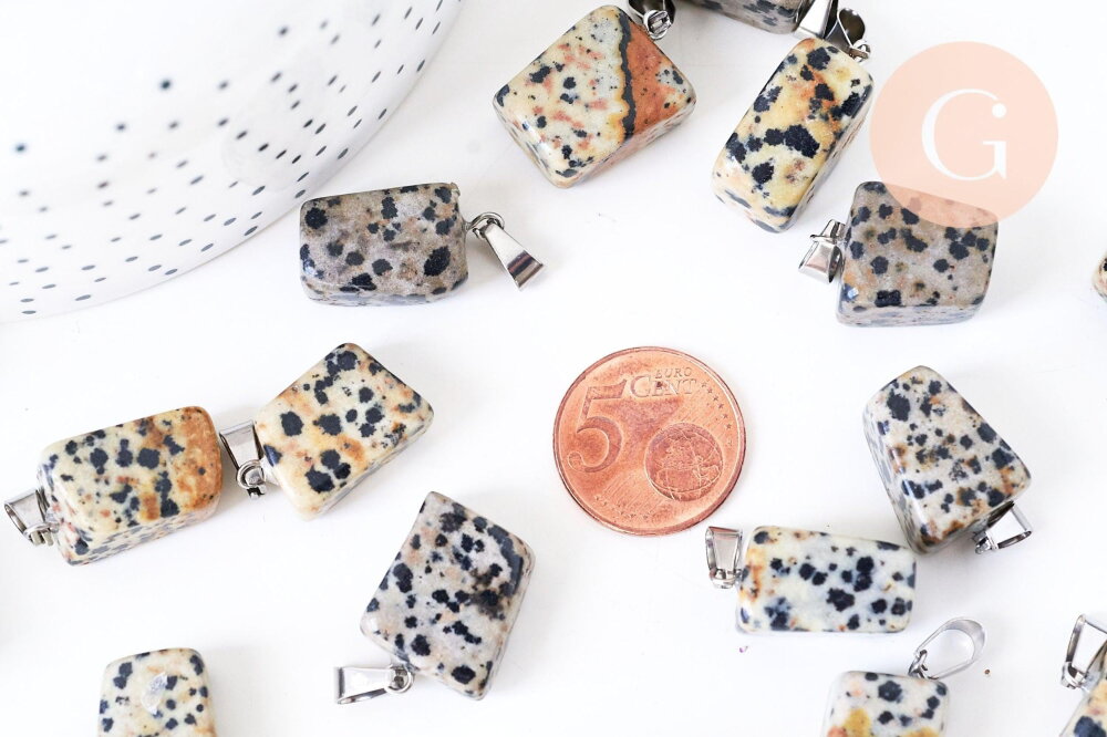 Vous pourrez composer de magnifiques sautoirs en utilisant ce pendentif minéral en jaspe dalmatien naturel sur un support couleur platine