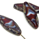 Perles tchèques navettes, ovales, verre pressé, divers tons bordeaux, bleu, gris, noir, vert, 25 x 10 mm, vendue par lot de 2 ou 4