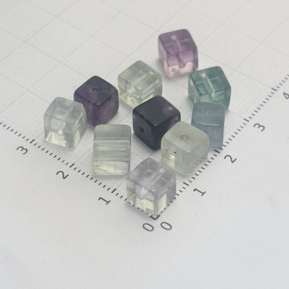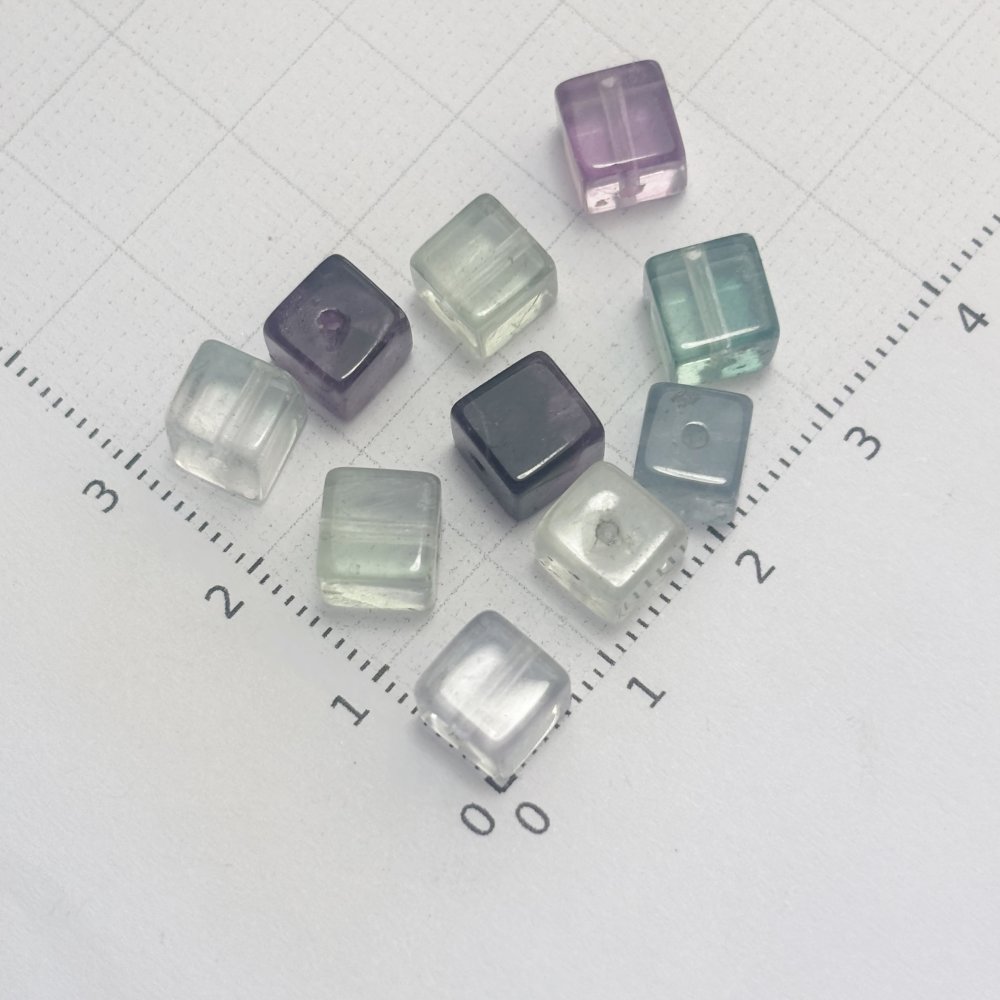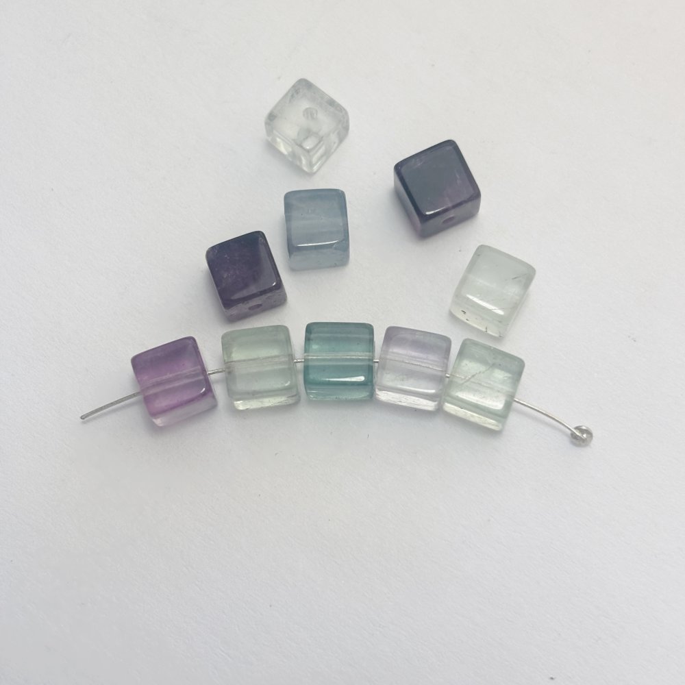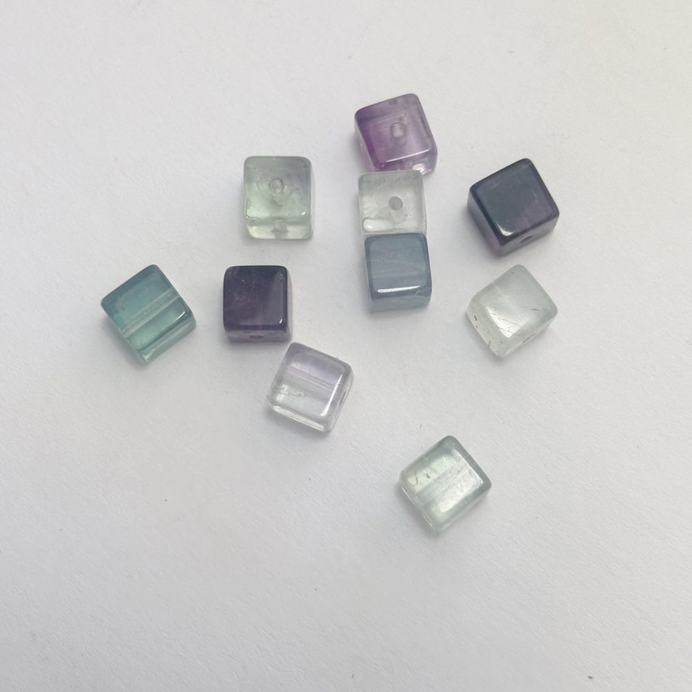 Lot n°4 de 10 perles en fluorine cube (≈7 mm). Pierre fine fragile, aux nuances vertes, bleutées et violettes. Idéales pour créations de bijoux raffinés et lumineux.