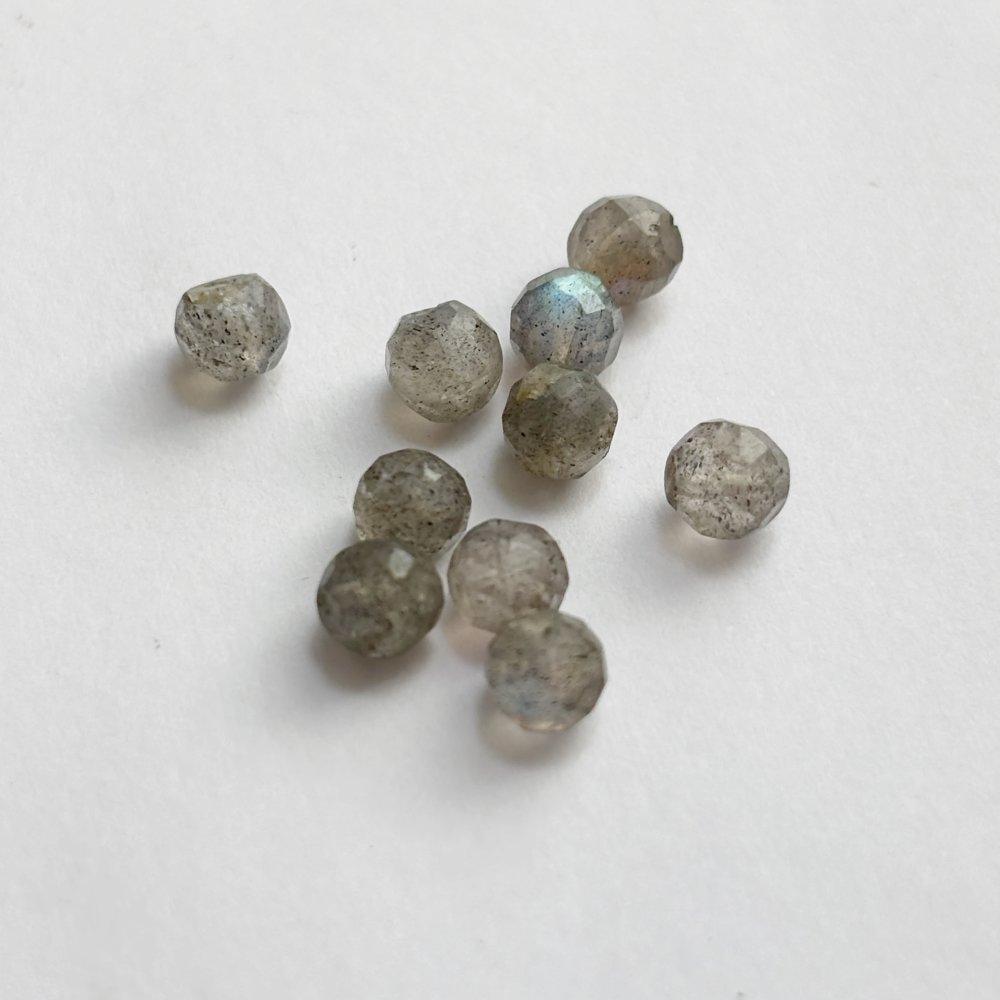 Lot de 10 perles facettées en labradorite naturelle 5 mm, aux reflets bleus et dorés. Idéal pour vos créations de bijoux artisanaux et élégants.
