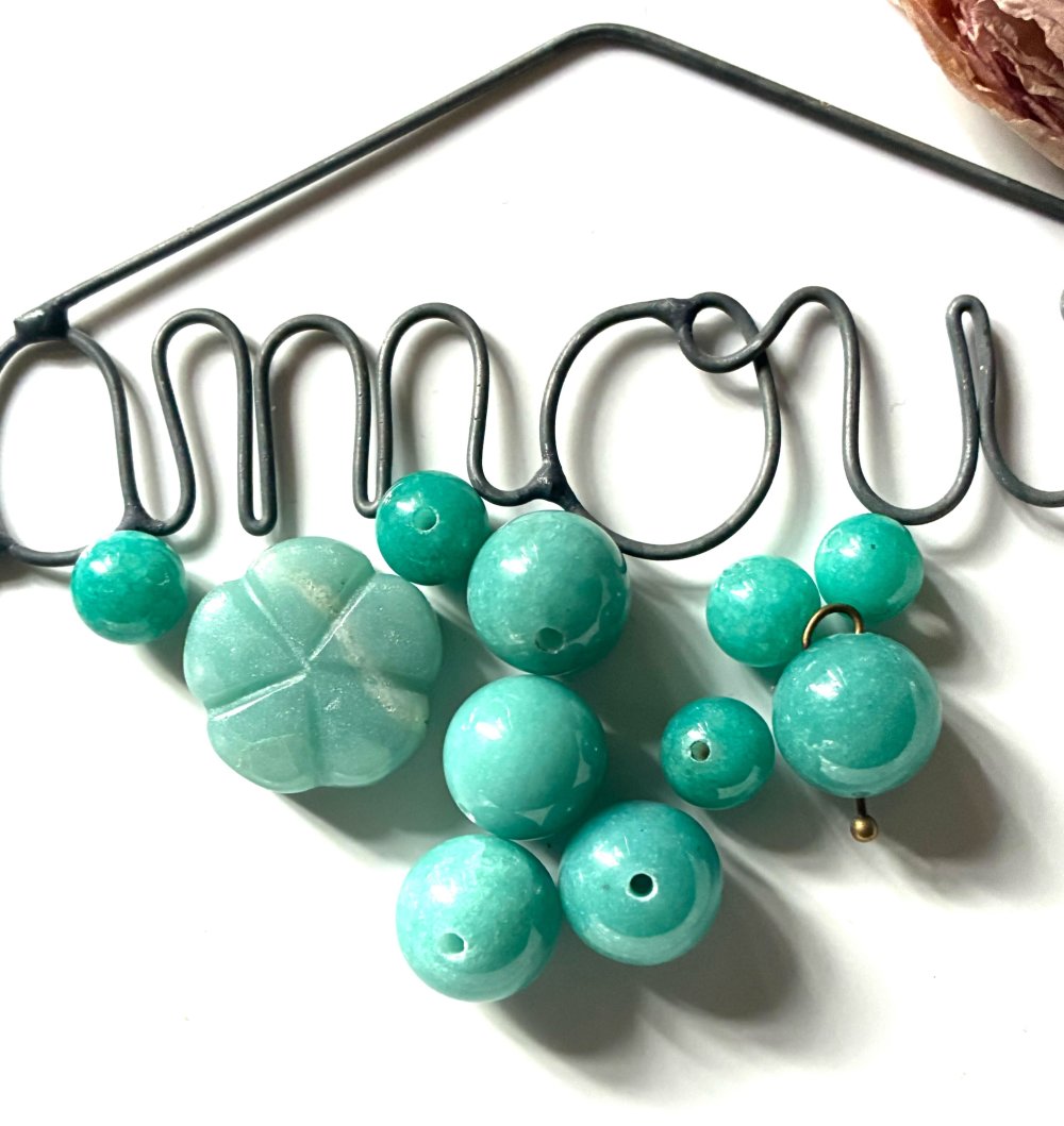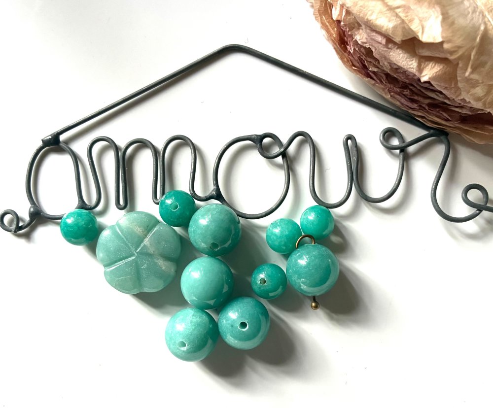Ce lot est composé de 11 perles en amazonite, rondes diamètre 5mm à 13mm, percées et fleur.