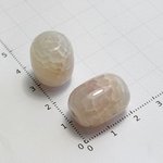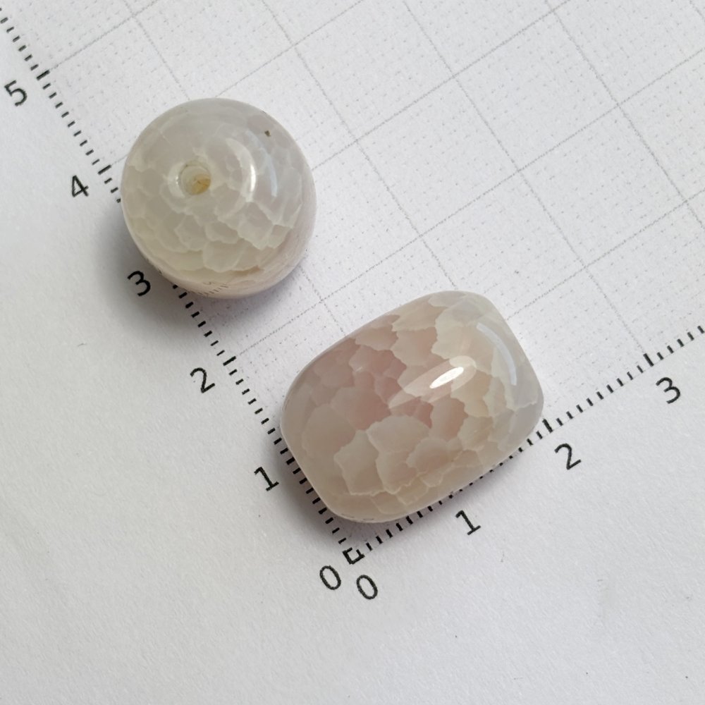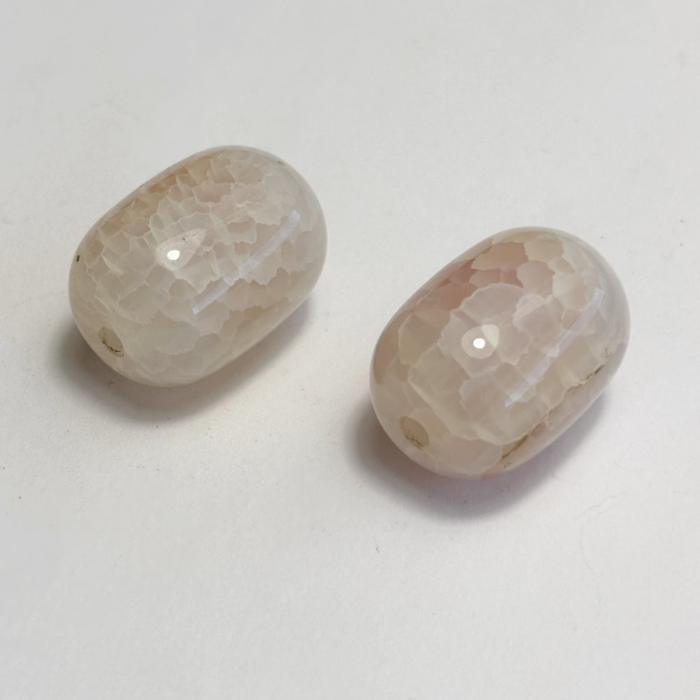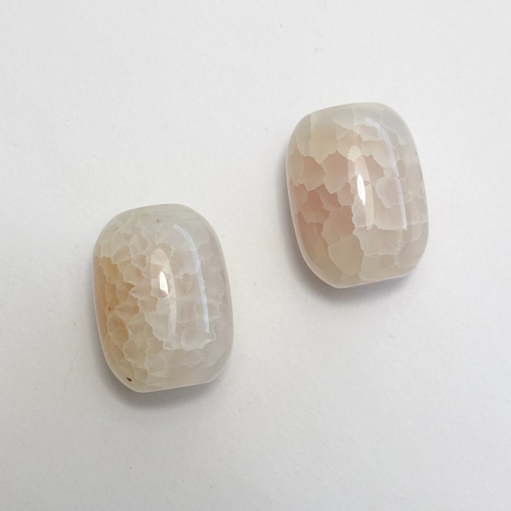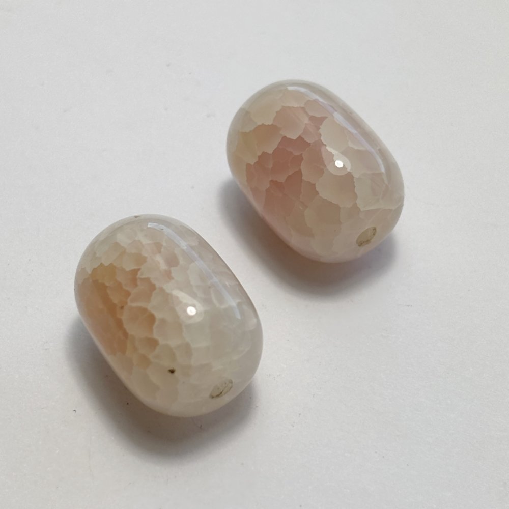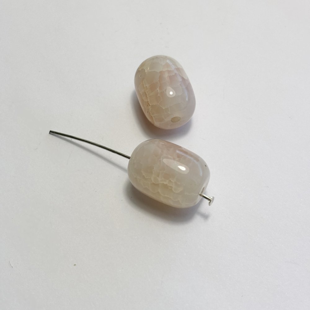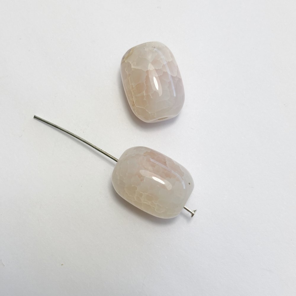 Deux perles en agate craquelée naturelle, 20 × 15 mm, forme cylindre légèrement bombée. Nuances douces, éclat brillant et surface veinée typique.