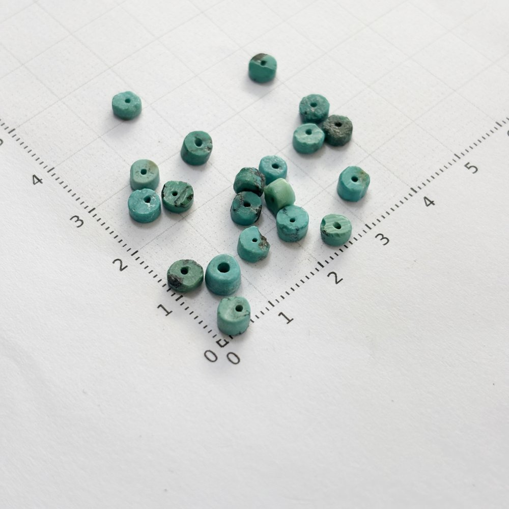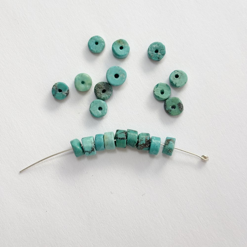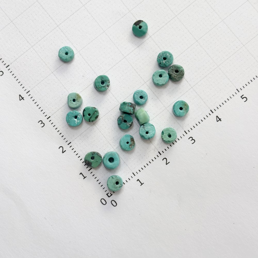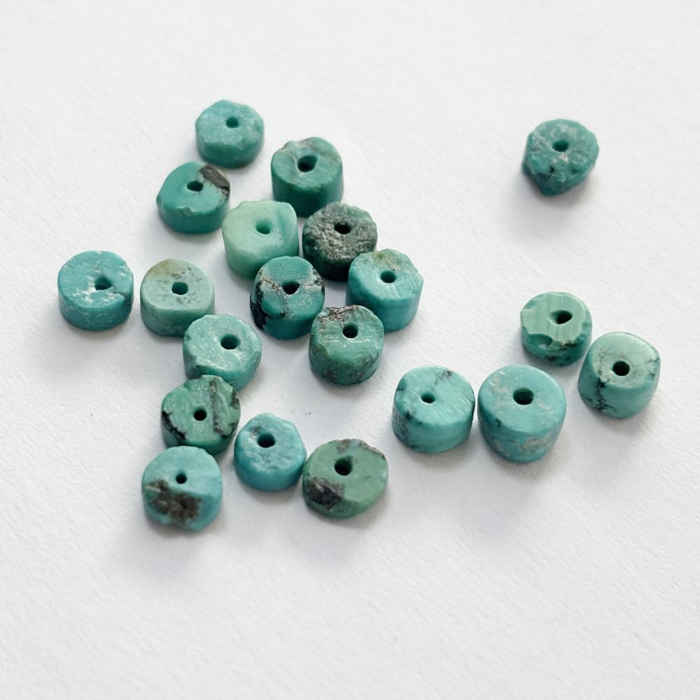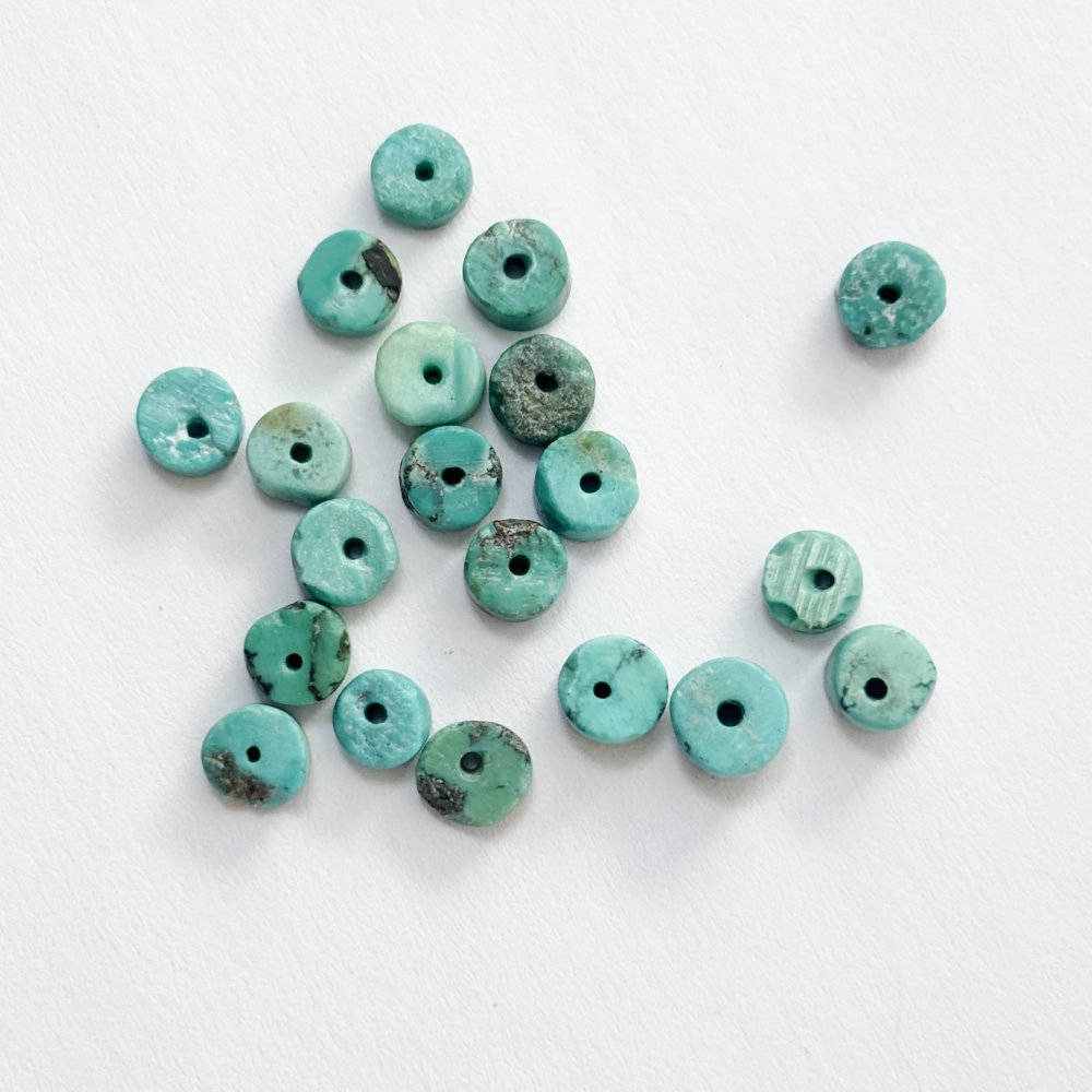 Lot de 20 petites perles en turquoise naturelle, forme tranche irrégulière, 4,5 mm de diamètre, 2 à 3 mm d’épaisseur. Teintes bleu-vert veinées. Idéales pour vos créations.