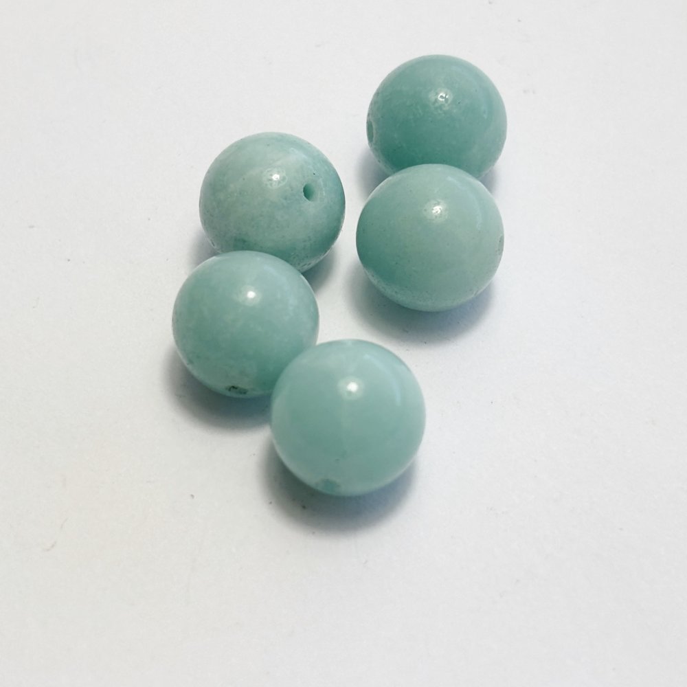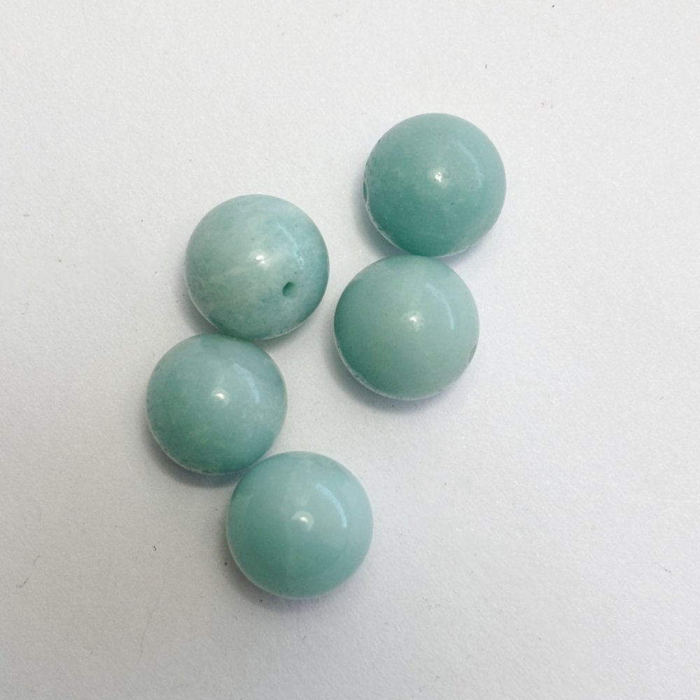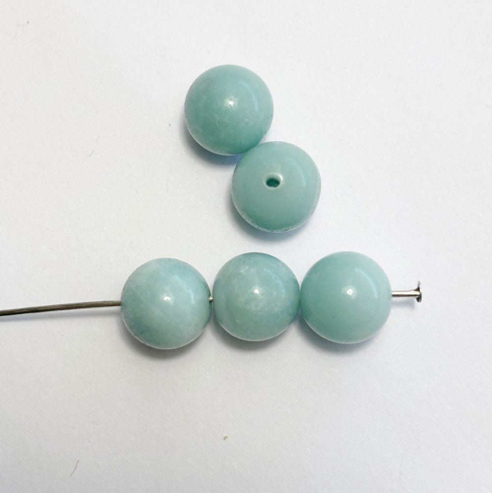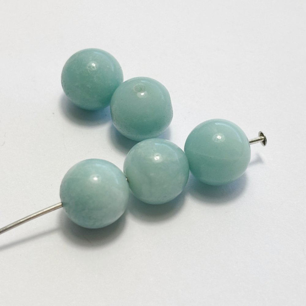 Lot de 5 perles sphériques en amazonite naturelle de 10 mm, polies à la main. Pierre apaisante, idéale pour bracelets et colliers. Couleur bleu-vert douce et lumineuse.