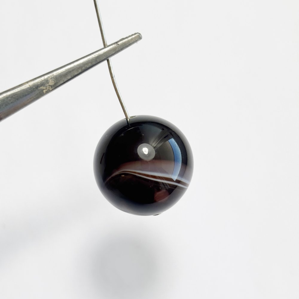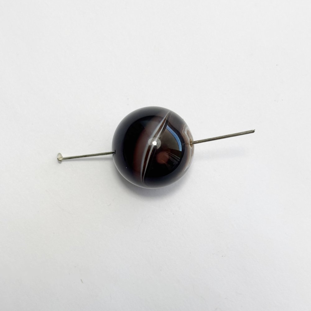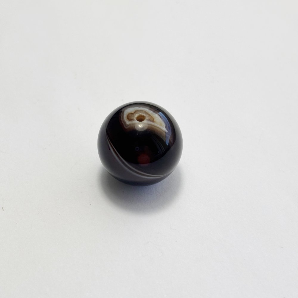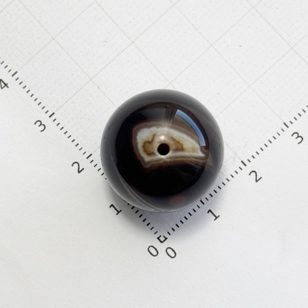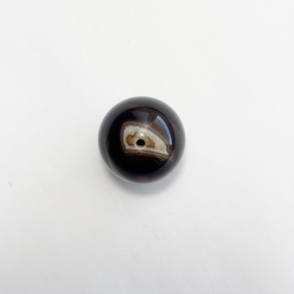 Perle naturelle en agate noire rubanée de 20 mm, aux bandes brunes et ivoire. Une gemme raffinée et lumineuse, idéale pour vos créations de bijoux haut de gamme.