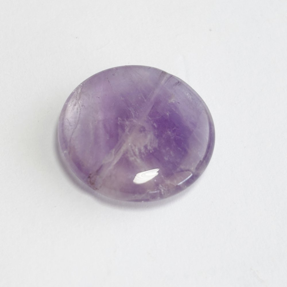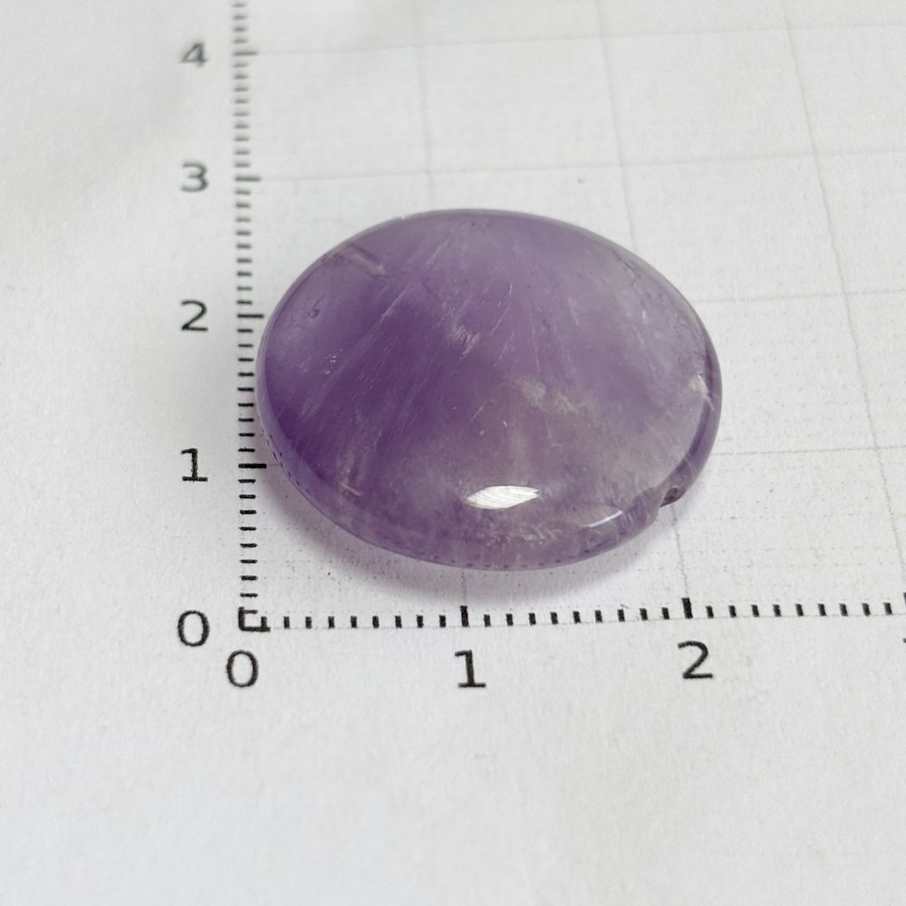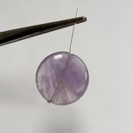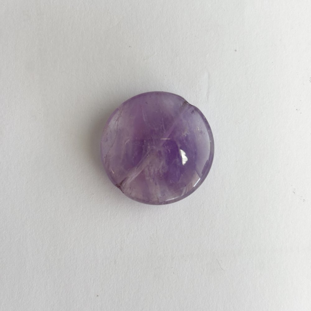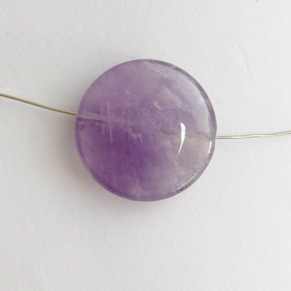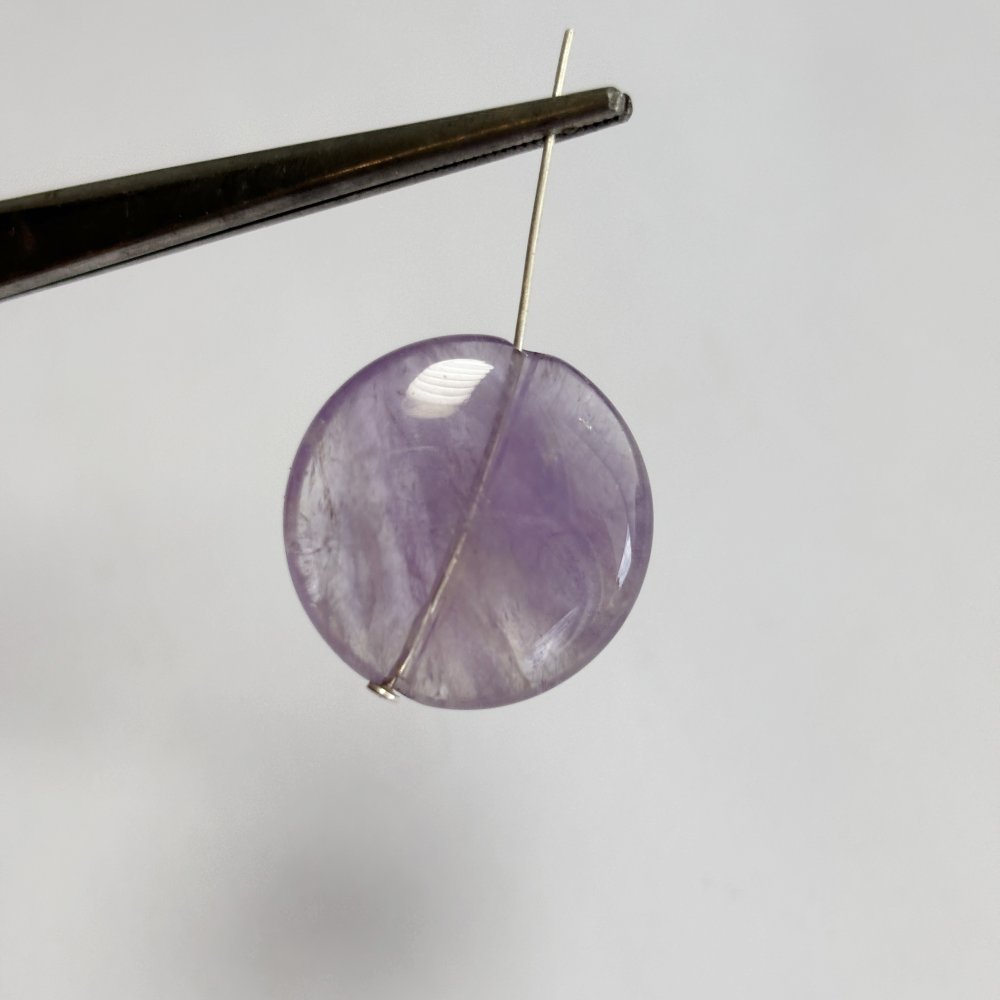 Perle en améthyste lavande naturelle de 22 mm, taillée en disque plat légèrement bombé. Sa teinte douce et ses reflets translucides apportent une touche raffinée à toute création de bijou.