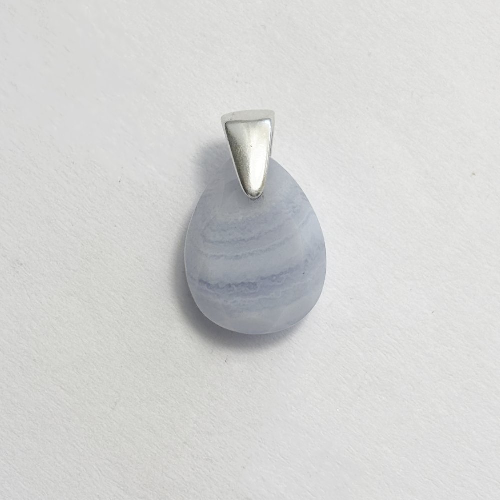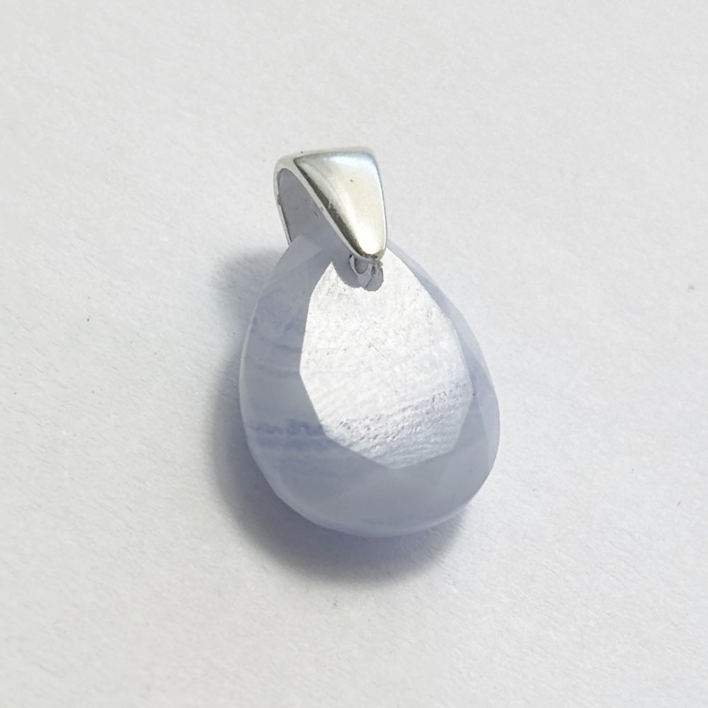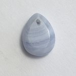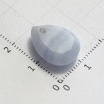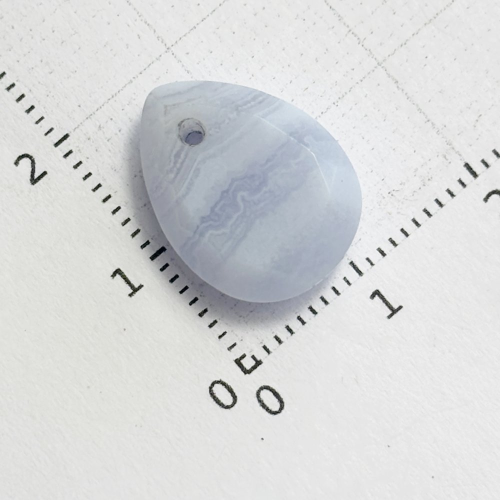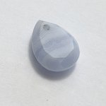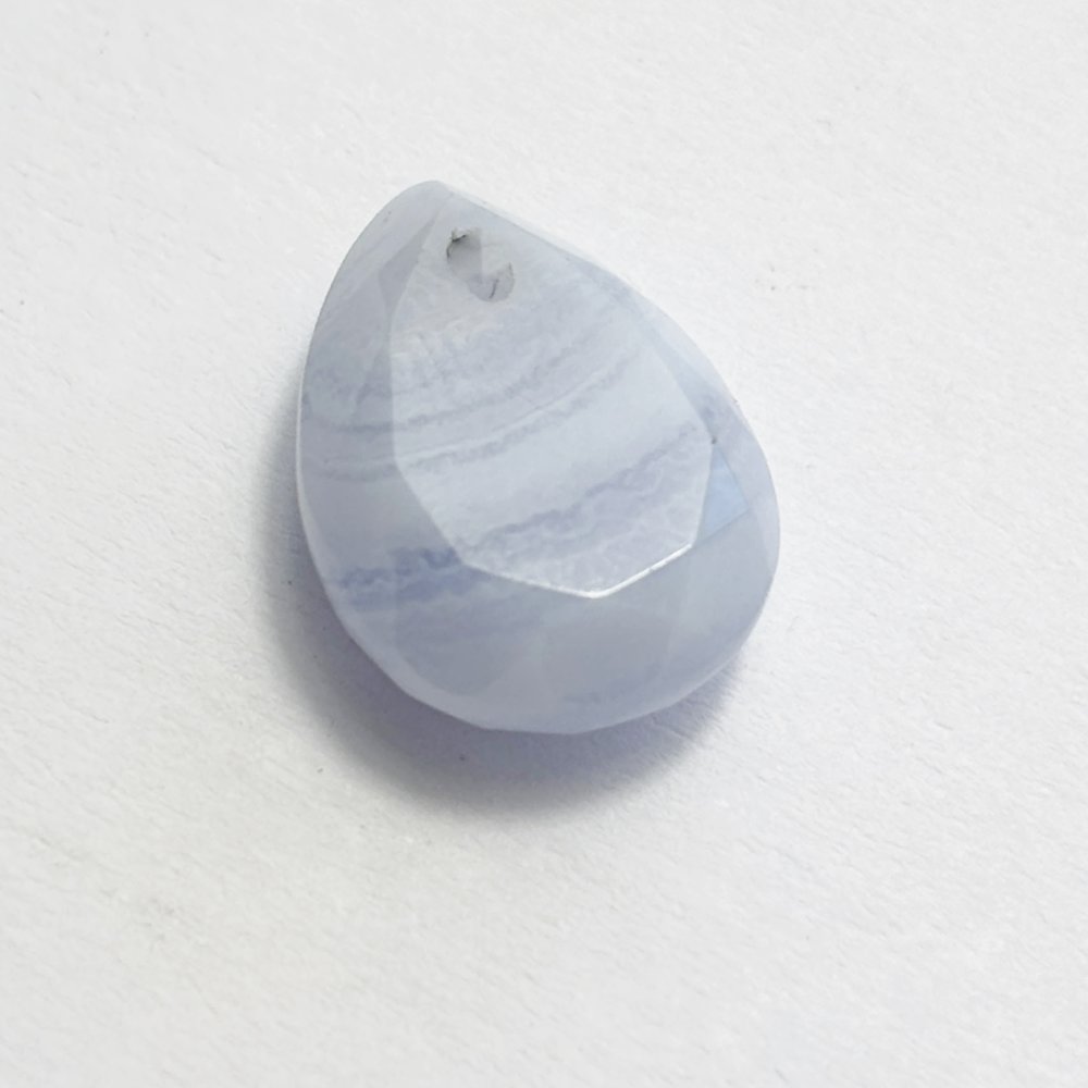 Perle en calcédoine bleue naturelle facettée, forme larme 16 mm avec trou transversal 1,4 mm. Élégance et douceur pour vos créations, vendue à l’unité.