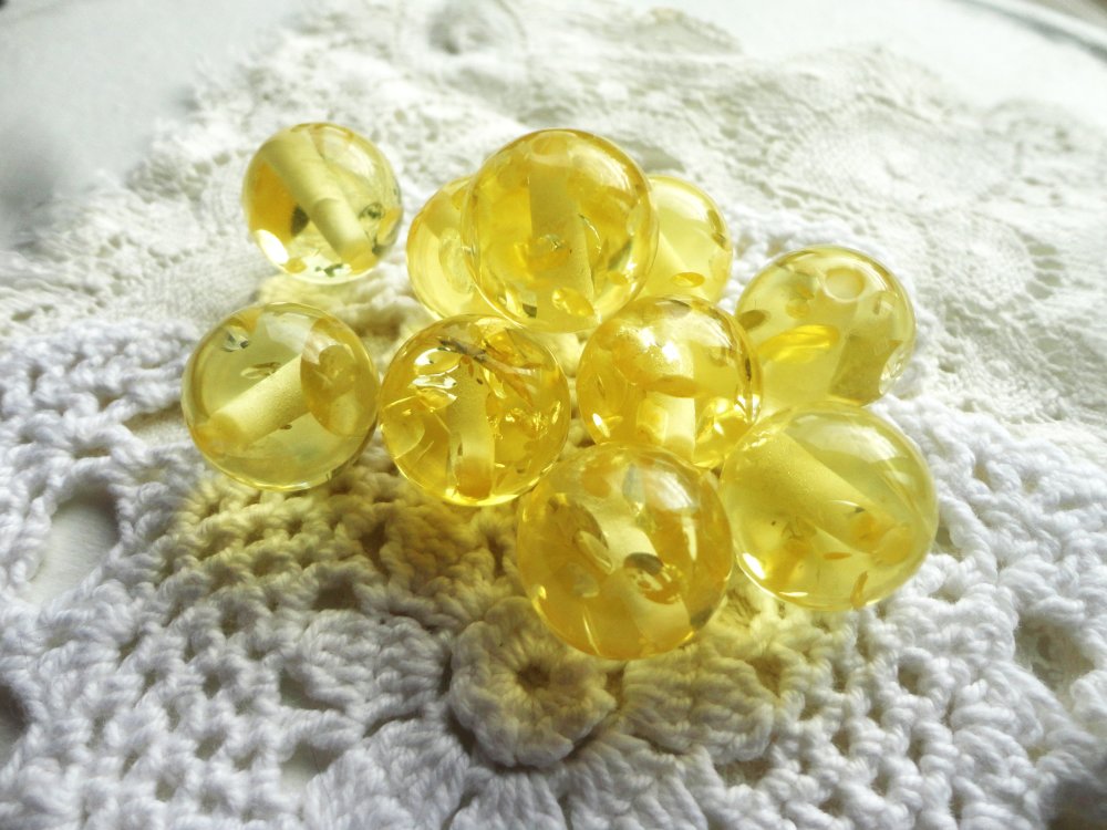 perle résine transparente et or, perle ambre, imitation ambre, ronde, 15 mm, inclusion