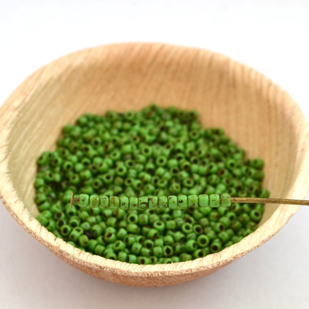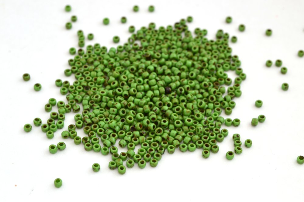 5 grammes de mini perles de rocaille Toho Amiet 11/0 en verre coloris vert tacheté marron