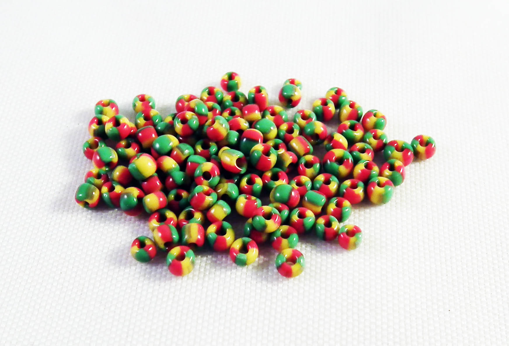 Lot de 10 mini Perles de Rocaille en verre Couleurs Jamaïque Vert Rouge Jaune Bob Marley Peace & Love, Diamètre moyen 2mm.
