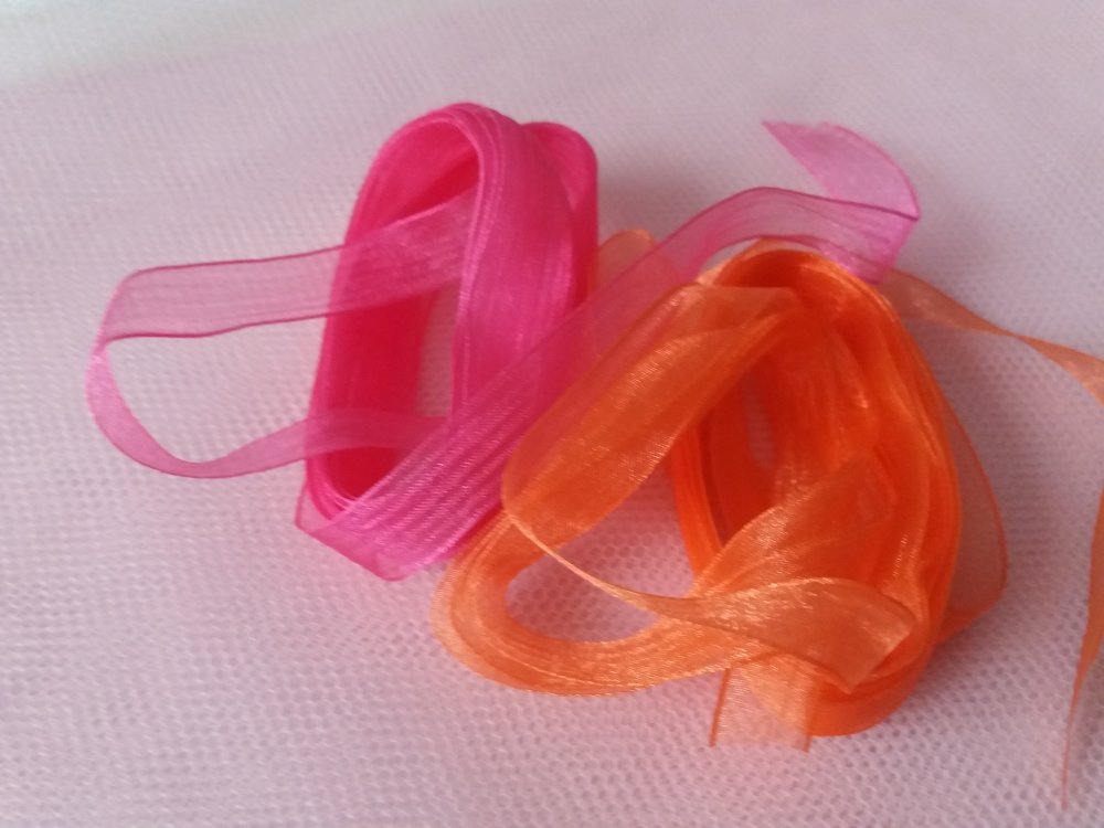 Je vous propose ces deux rubans en organza, très lumineux, l'un rose foncé, l'autre orange, chacun mesurant 2,50 m pour une largeur de 1 cm environ.