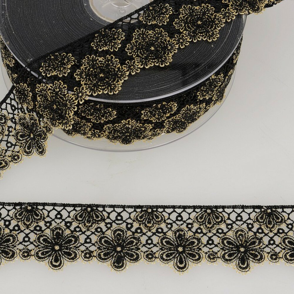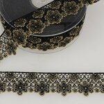 Bobine 14,4m Dentelle fleurs bi-ton 33 mm polyester Couleur: Noir et or