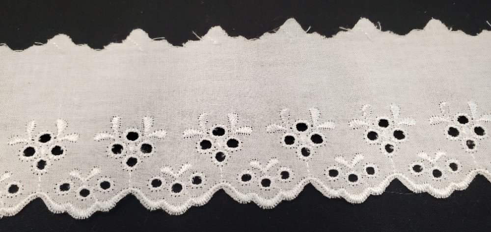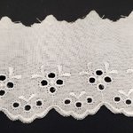 Élégante broderie anglaise blanche de 5,5 cm sur coton léger. Un galon aux motifs ajourés traditionnels et festonnés. Idée Couture : Parfaite pour border une robe d'été, embellir du linge de maison ou réaliser des vêtements d'enfant raffinés