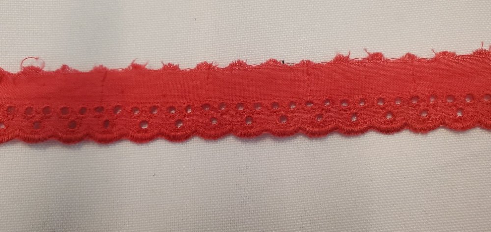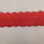 Cette broderie anglaise de 2 cm de largeur se distingue par sa teinte rouge éclatante et ses perforations régulières brodées avec soin.