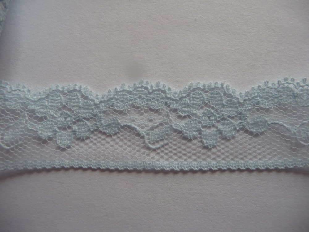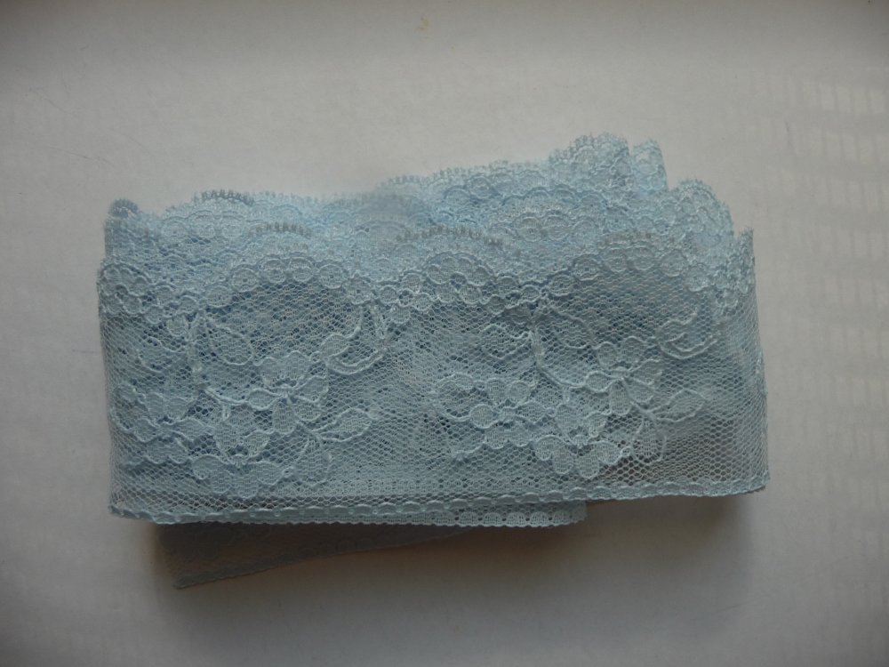 Je vous propose une jolie dentelle bleu-ciel, assez fine, d'une longueur de 3,30 m sur 2 cm de largeur.