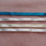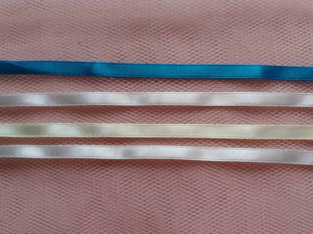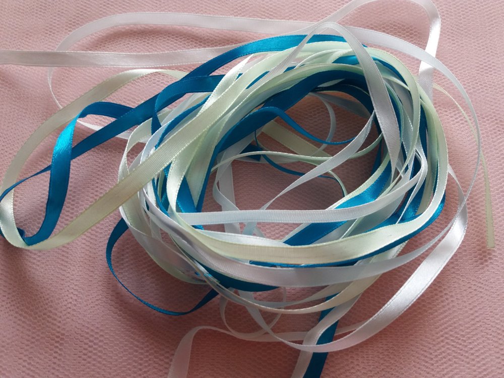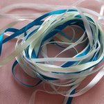 Joli mélange de 4 rubans satin de 2 m de longueur chacun sur 6 mm de largeur, couleurs bleue, blanche, blanc-cassé et vert pâle.