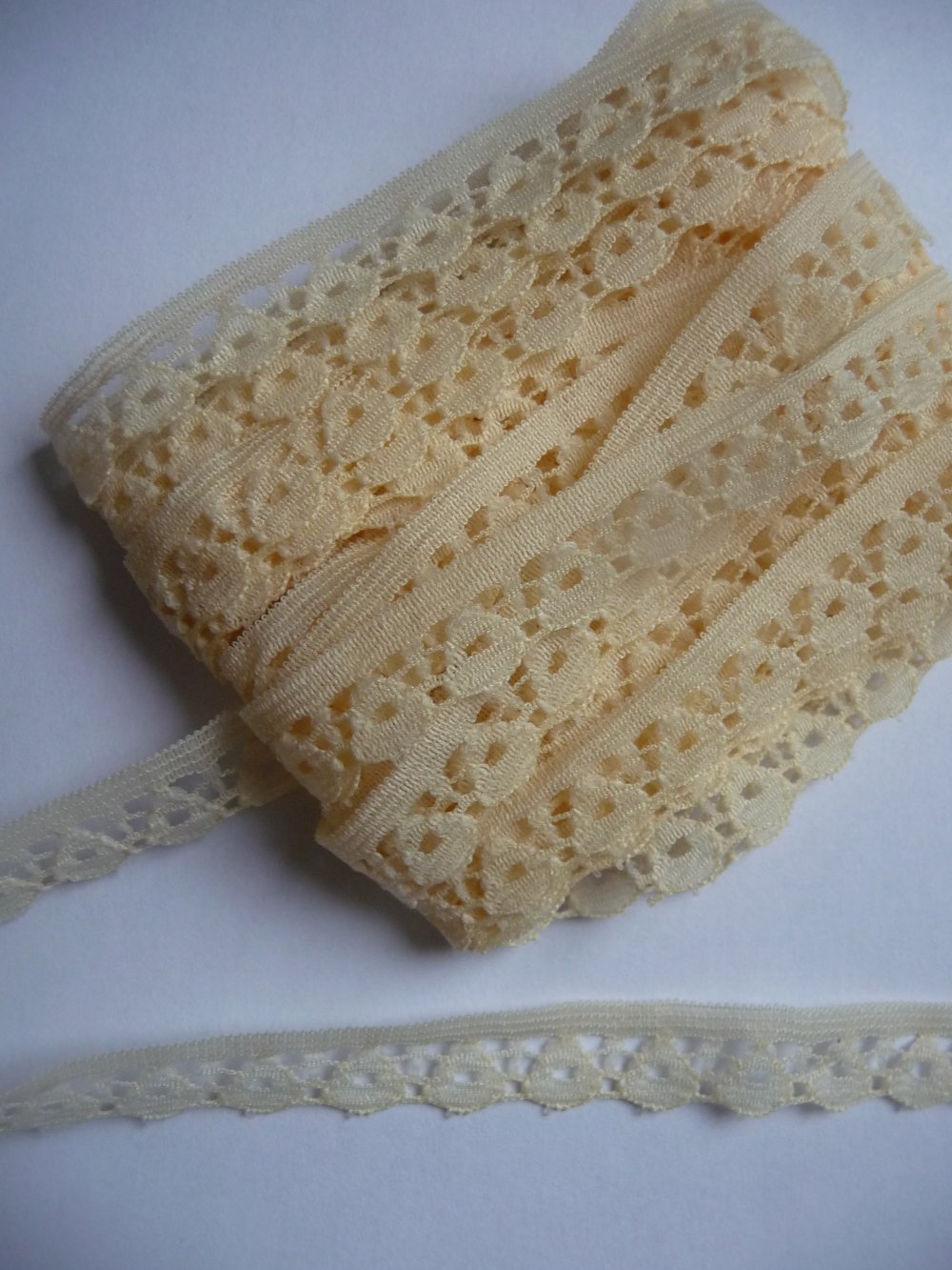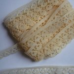 Petite dentelle fine et délicate, couleur écrue/chair de 4,5 m de longueur sur 8 à 9 mm de largeur.