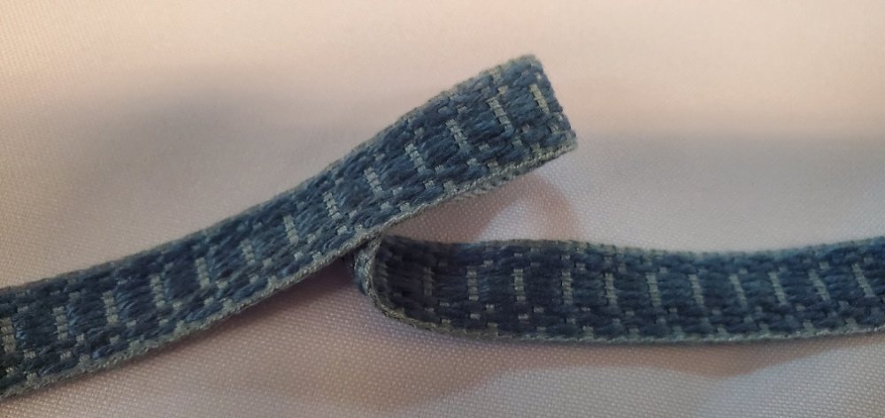 Ruban texturé bleu de 15 mm au tissage renforcé. Idée Couture : Finition de coussins, réfection de sièges ou accessoires robustes.