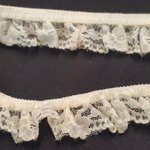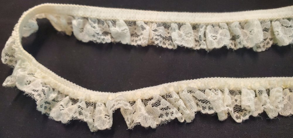 Délicat ruban de 25 mm composé d'une fine dentelle crème froncée sur une base élastique discrète. Idée Couture : Parfait pour border de la lingerie, agrémenter des vêtements d'enfant ou apporter une finition vaporeuse à vos accessoires