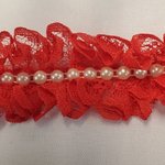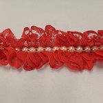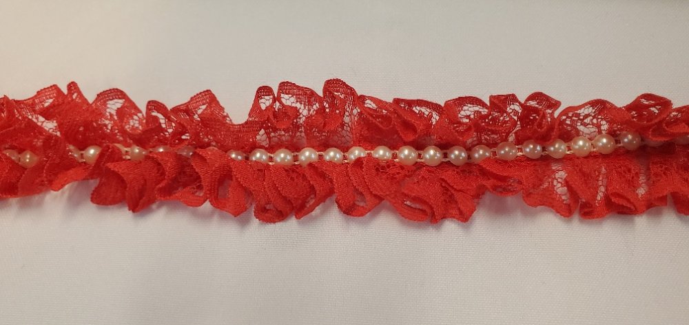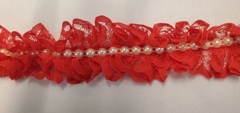 Spectaculaire ruban de 4 cm en dentelle rouge vif froncée, orné en son centre d'une rangée continue de perles nacrées ivoire. Idée Couture : Parfait pour sublimer une tenue de fête, créer des accessoires de coiffure