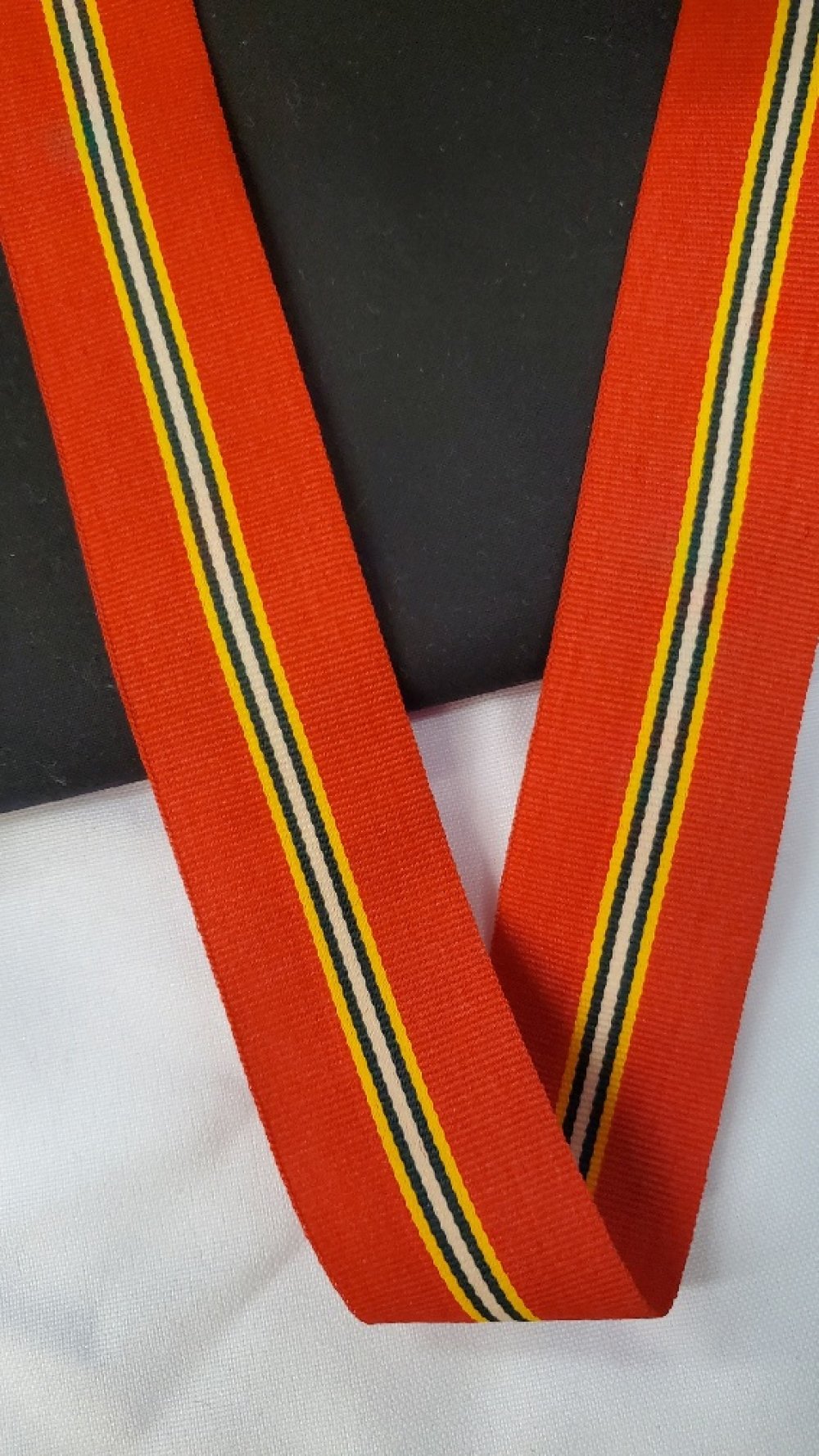 Large ruban gros grain de 35 mm orange vif orné d'un fin liseré central tricolore noir, blanc et jaune. Idée Couture : Parfait pour confectionner des anses de sacs dynamiques, des sangles de bagagerie ou des accessoires au style sportif et vitaminé.