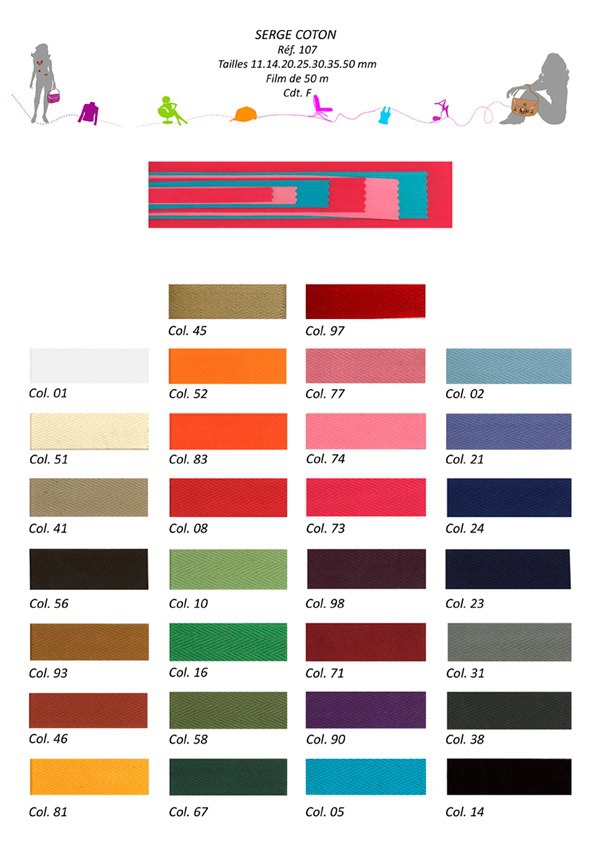Ruban sangle sergé 100% coton de fabrication européenne de très belle qualité. En raison de la matière naturelle du coton, la teinte peut être différente selon les bains.
