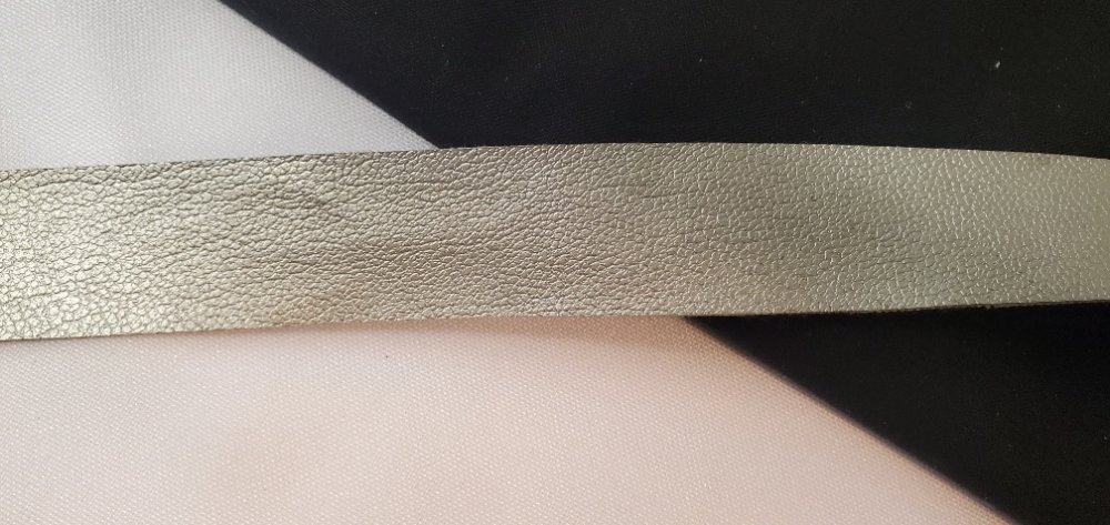 Ruban souple en simili cuir de 25 mm avec une finition gris argenté métallisé. Idée Couture : Parfait pour créer des ceintures fines, des anses de pochettes ou apporter une touche moderne à un vêtement.