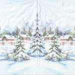 Chalet au milieu des sapins dans paysage couvert de neige.