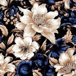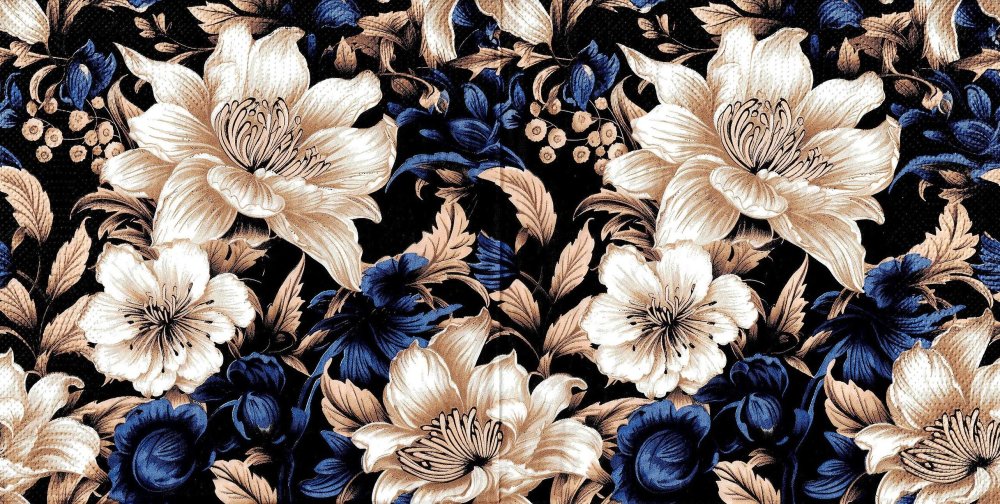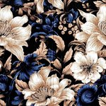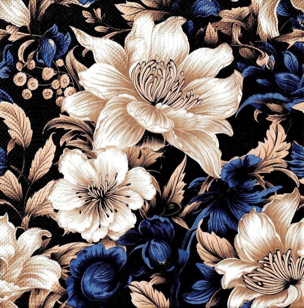 Grande fleur blanche et bleu sur fond noir style victorien.