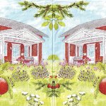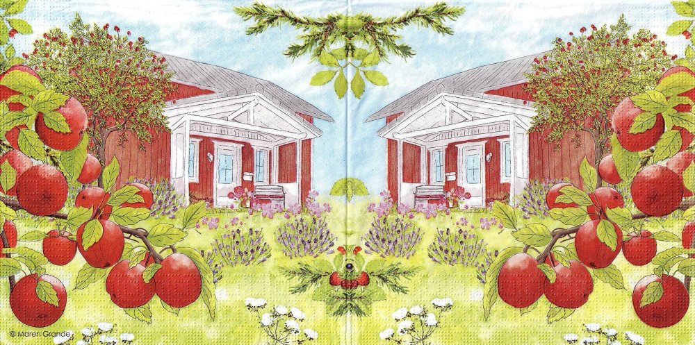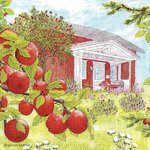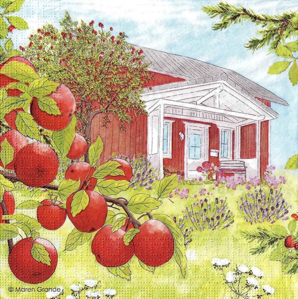 Maison dans la campagne suédoise entourée de pommiers, petites talles de lavande.