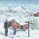 Randonneurs à ski en montagne devant chalet d'alpage.