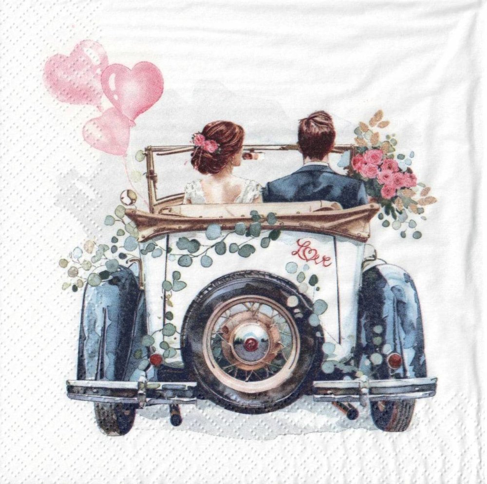 Les mariés en voyage de noce dans voiture ancientte.