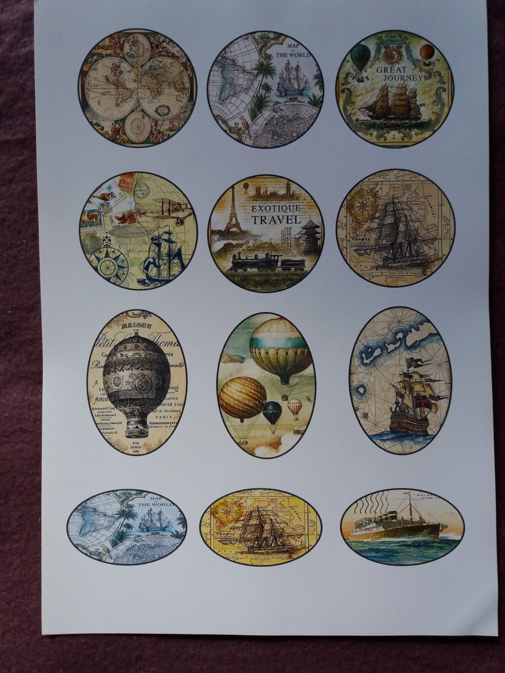 Ensemble de vignettes autocollantes (planche adhésive d'images) pour créations diverses, albums, carnets de voyages, carterie, décorations inspiration "Tour du Monde", globes terrestres, vieux bateaux, vieux gréements, évocations voyages lointains ...