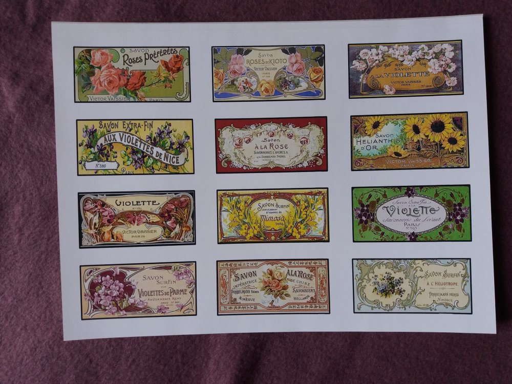 Planche adhésive d'images anciennes étiquettes de savons pour créations originales et personnalisées.