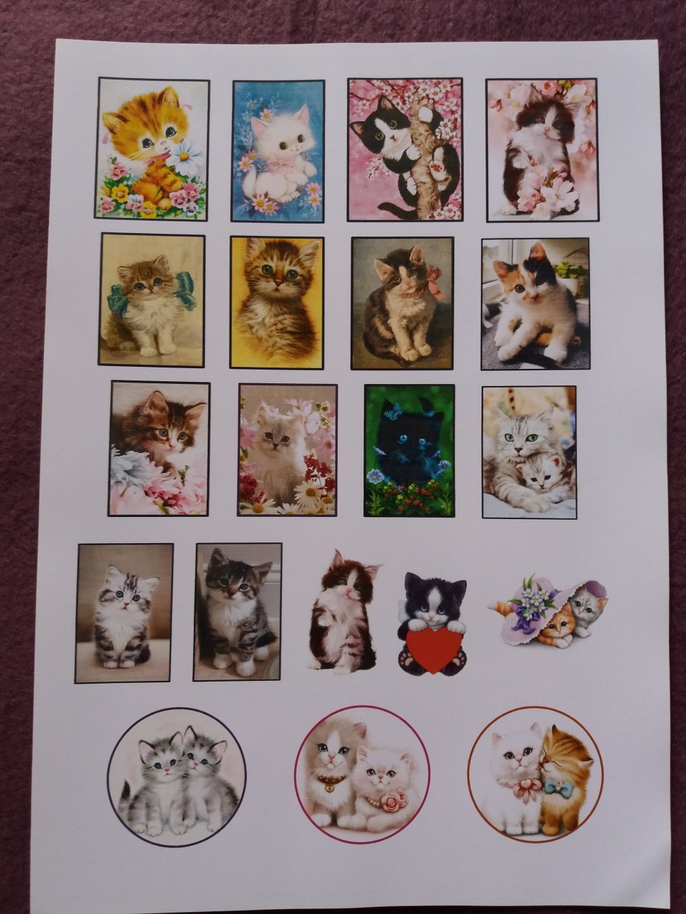 Planche adhésive de différentes images de petits chats à découper et à coller sur tous supports (papier, carton, bois, métal, verre, ...).