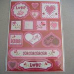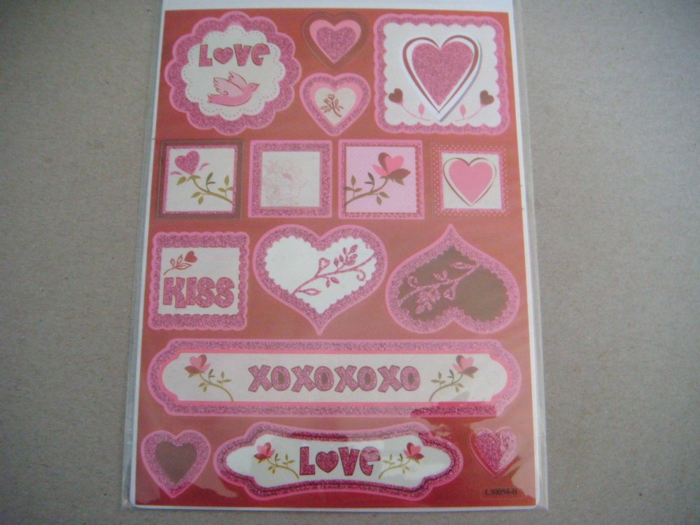ce très beau lot de 15 stickers autocollants scintillants sur le thème de l'amour dans les tons: rouge,fuchsia,blanc et blanc représentant des cœurs,des fleurs en forme de carré,rectangle et fleur avec inscriptions sur certain.