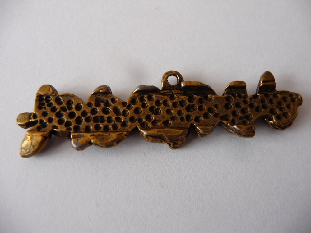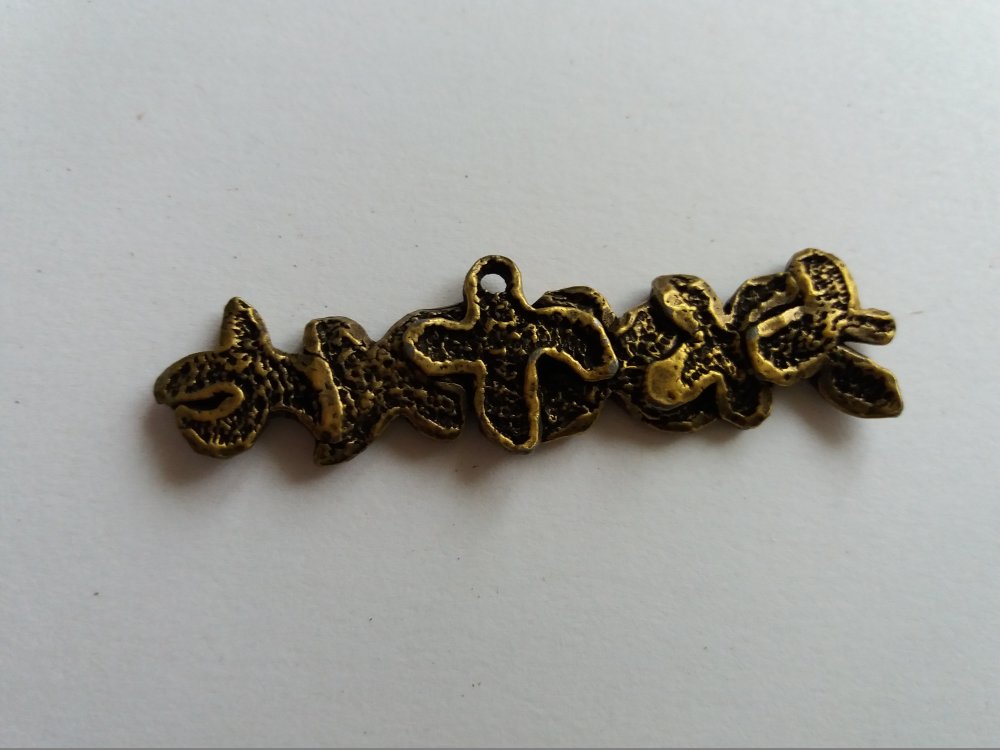 Je vous propose ce joli pendentif de très belle qualité, de forme allongée (environ 5,5 cm x 1,5 cm), en métal doré vieilli.