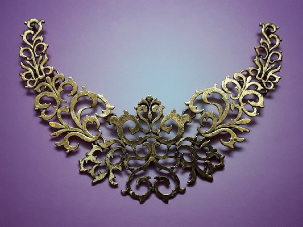 Support collier connecteurs à multiple trous, médiéval, articulé doré noir vieilli de à l'extrémité haut jusqu'à l'extrémité bas 13cm largeur 6cm, arc de cercle 17cm