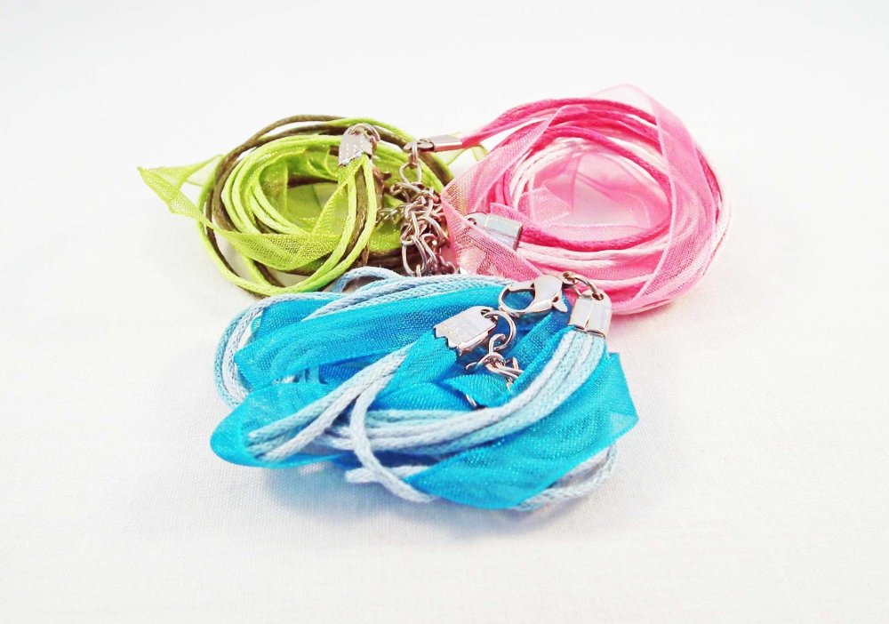 Lot de 3 Supports Colliers en Organza Ruban et Coton de couleurs Rose Vert Bleu, Longueur 45cm avec chaîne d'extension.