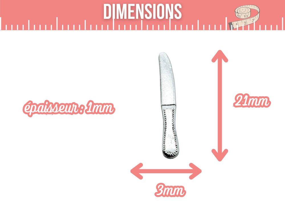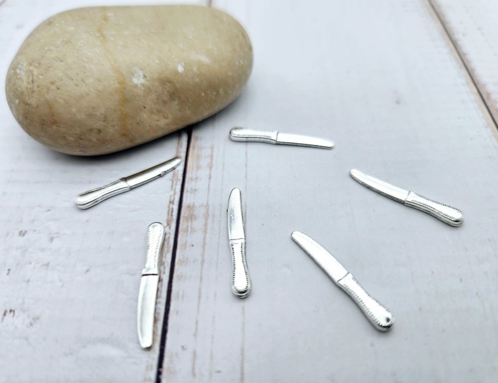 Chaque couteau est minutieusement détaillé, avec une belle teinte argent antique qui imite parfaitement les couverts réels. Leur format miniature les rend parfaits pour accompagner d’autres mini couverts, plats ou aliments miniatures 🍽️