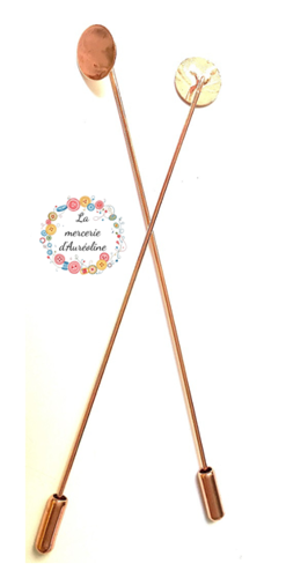 Fibule en métal de couleur cuivre rosé avec une base ronde plate de 10mm ; Ce support de broche mesure 9,3cm de long et est fourni avec un fermoir.