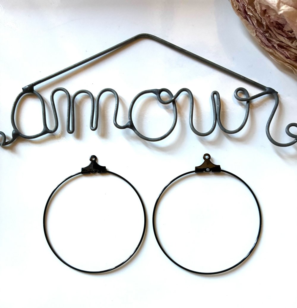 Ce lot est composé de 2 supports de boucles d'oreilles des créoles en métal noir de 4 cm de diamètre, d'autres tailles de créoles en boutique en métal argenté, en métal noir, en bronze