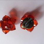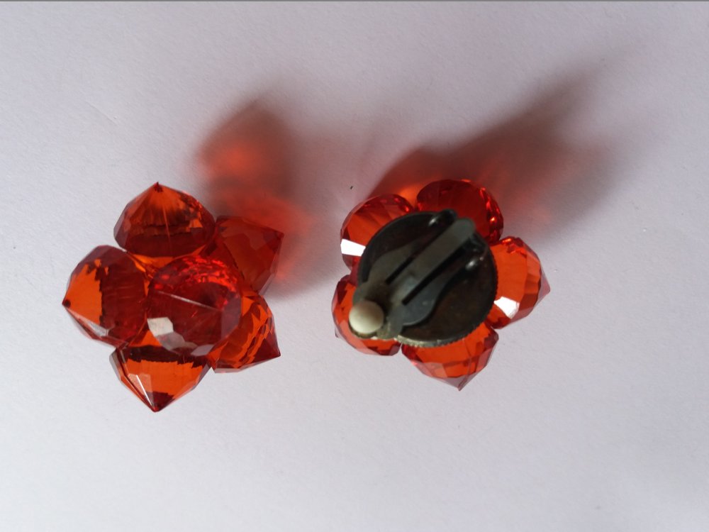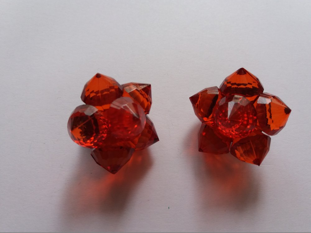 Voici une petite paire de boucles d'oreilles en plastique, forme fleur, composée de 6 perles coniques rouges. Diamètre de la boucle : 3 cm.