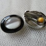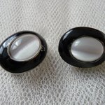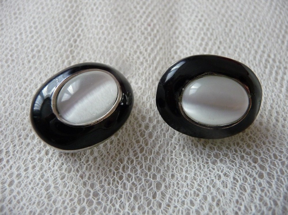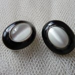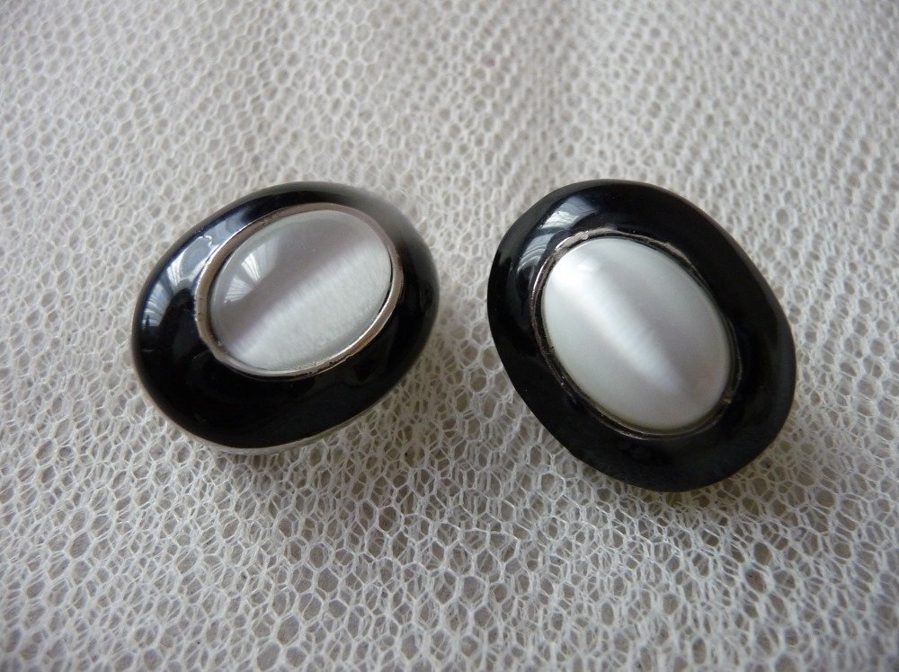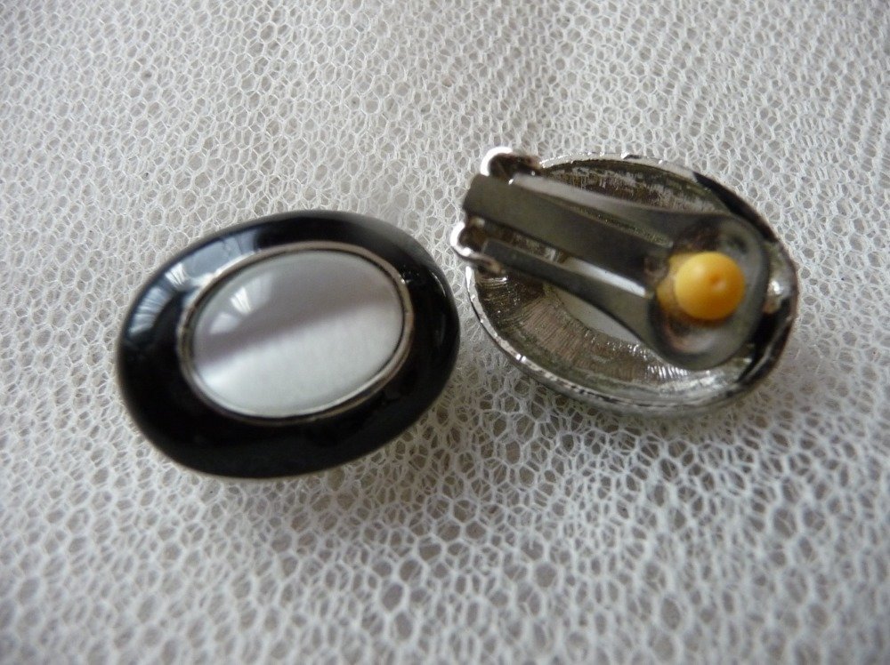 Voici une paire de boucles d'oreilles, forme ovale, bicolore noire et blanche (le centre est une perle "oeil de chat"), à clip, métal argenté.