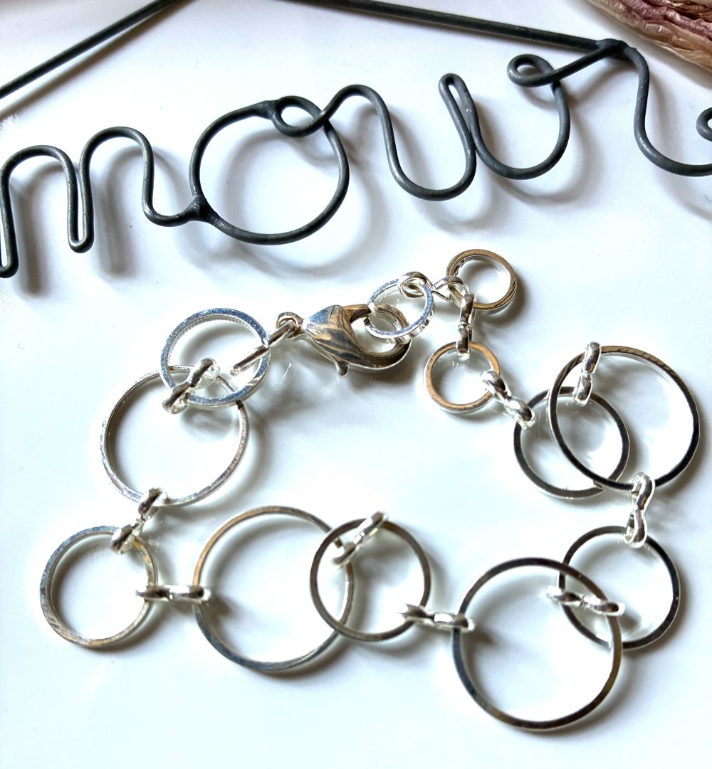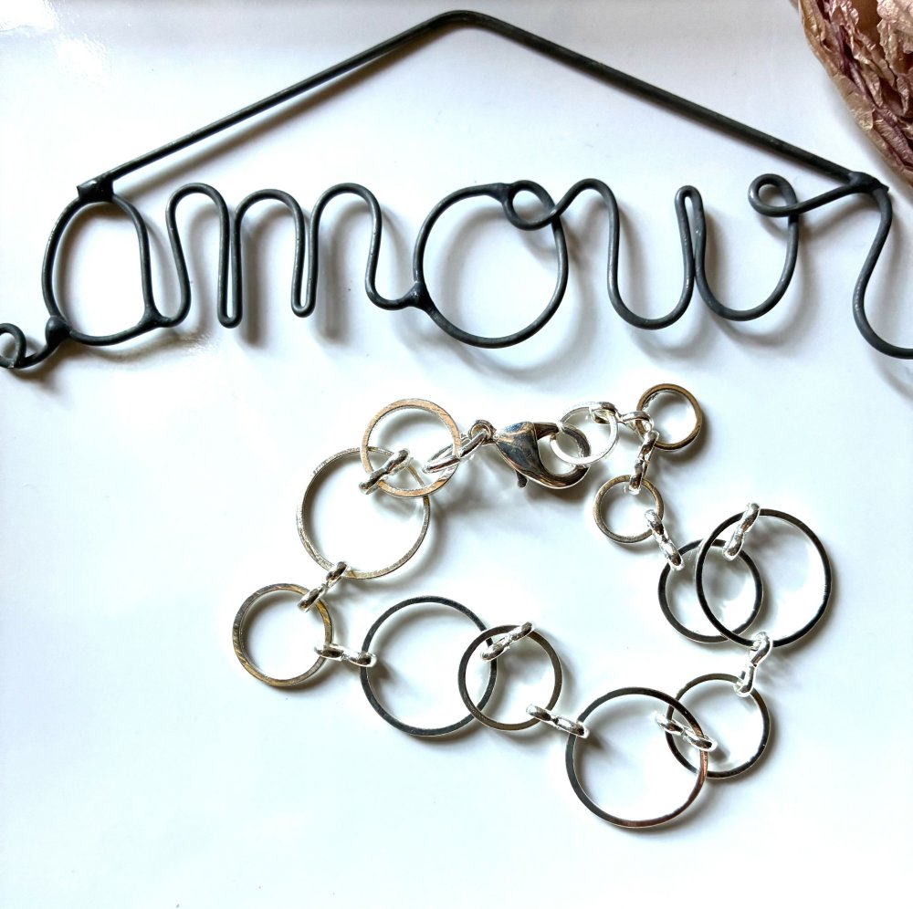 Ce bracelet original et fin en métal argenté avec maille ronde alternant des petits et des moyens anneaux d'environ 12 à 16mm m mesure 21 cm avec fermoir mousqueton.