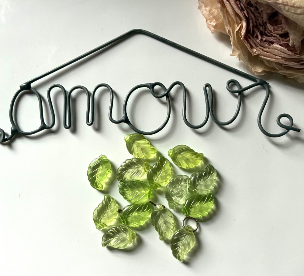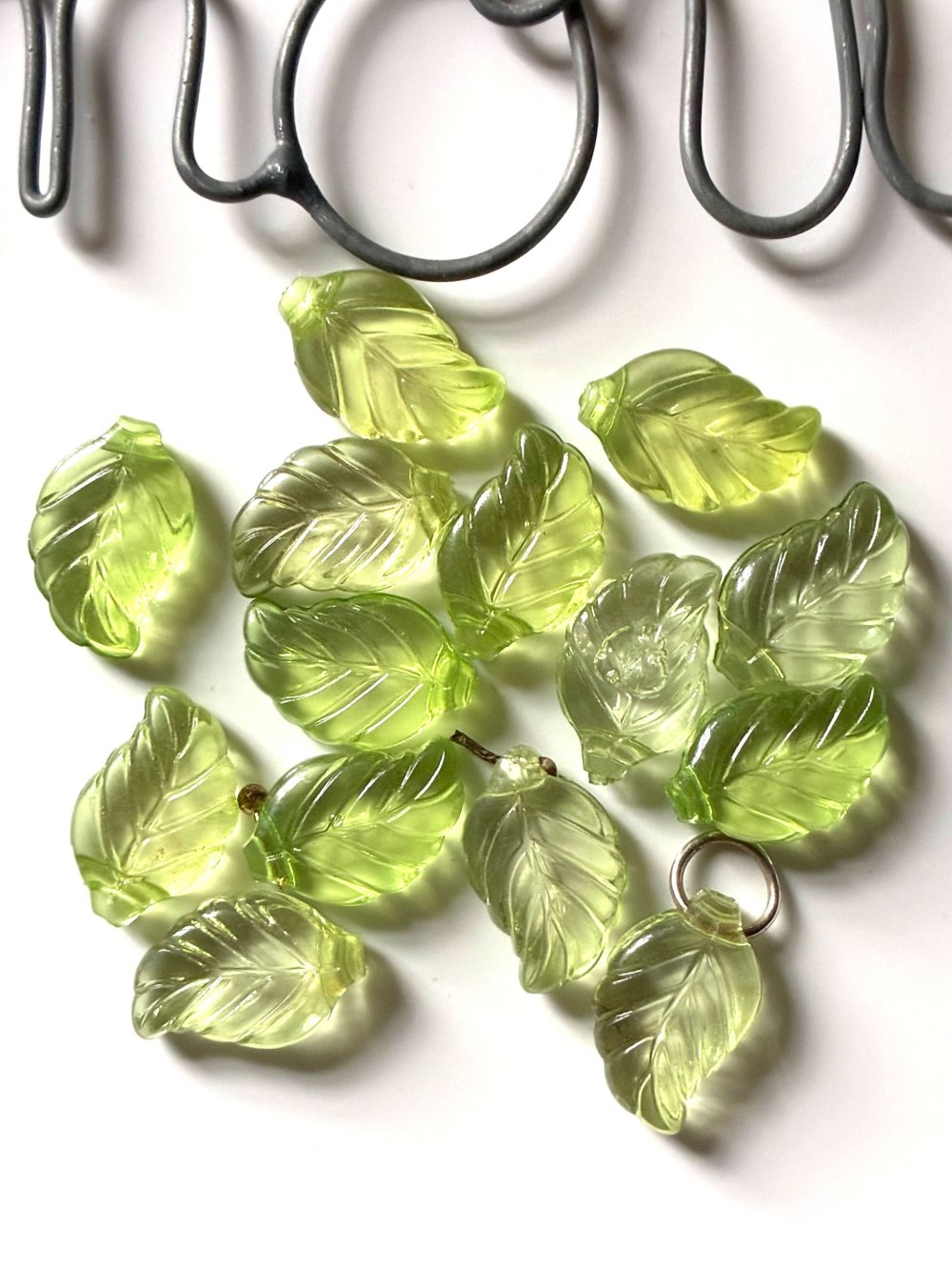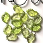 Ces 14 breloques en forme de feuilles mesurent 14mmx8mm, en vert, matière synthétique.